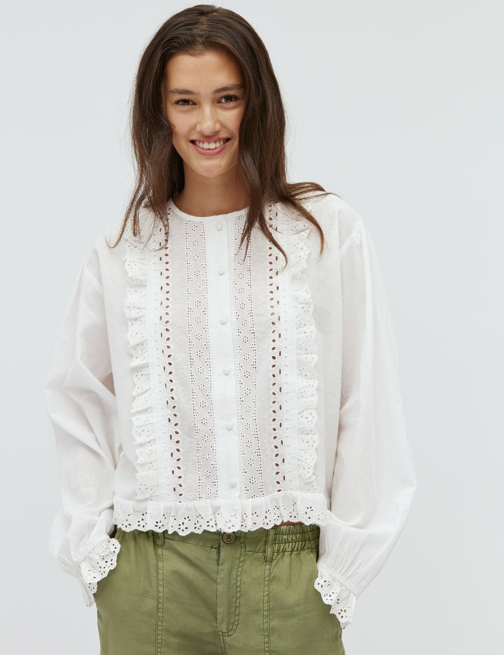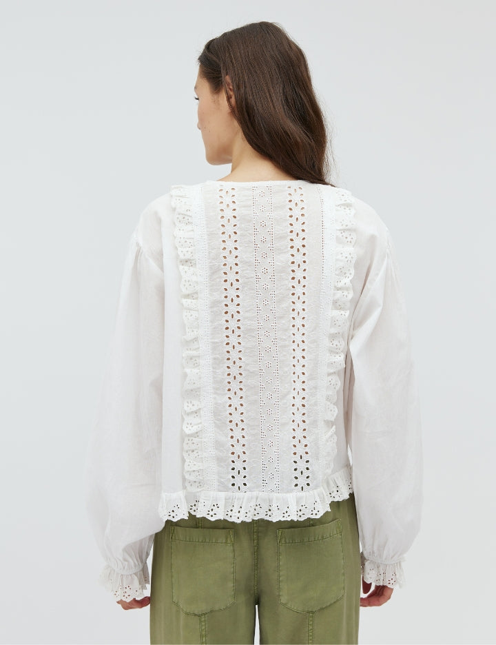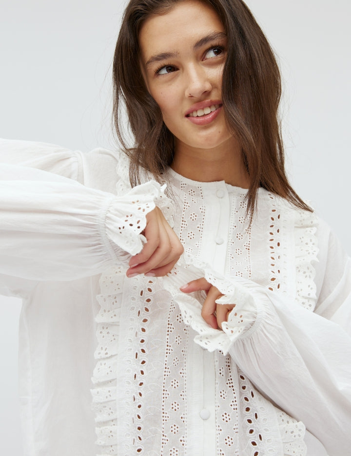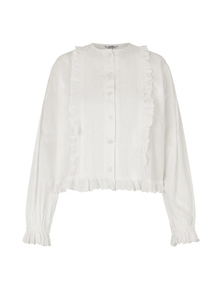 Skjorten har rund hals, lange ermer med volang i ermet og knappelukking i front.