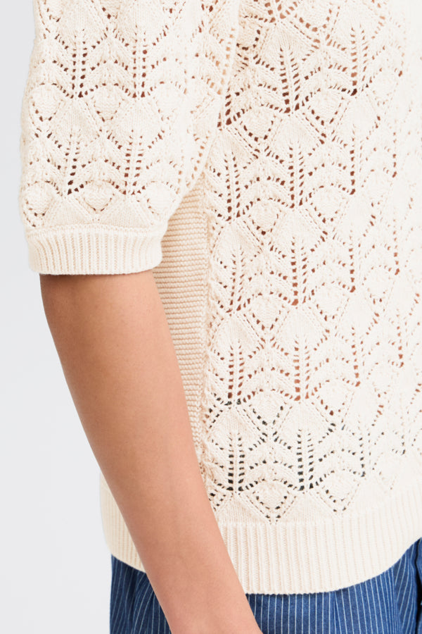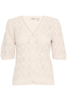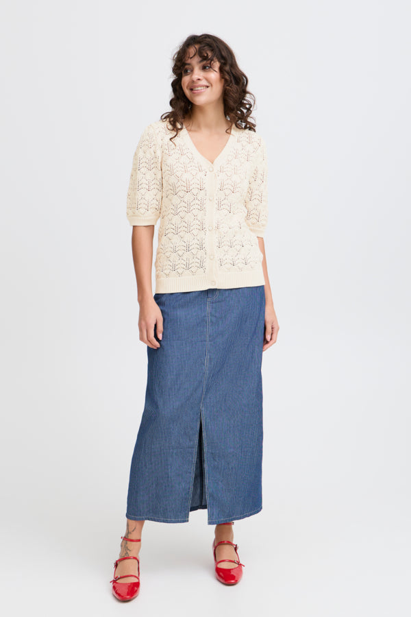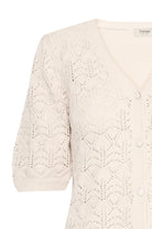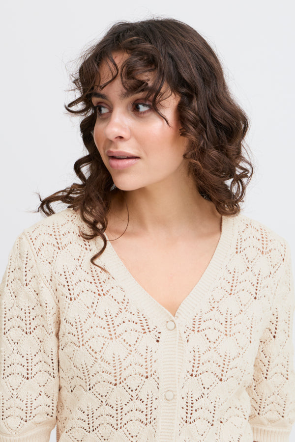 Frkateleen Cardigan fra Fransa er en vakker, strikket cardigan med et nydelig mønsterstrikk. Den er lett og behagelig, perfekt for lag-på-lag-styling året rundt. Med sin V-hals, knapper i front og ribbestrikkede kanter, kombinerer den klassisk eleganse med en avslappet passform. De 2/4-lange ermene gir et moderne preg og gjør den ideell for både hverdagsbruk og mer pyntede anledninger.