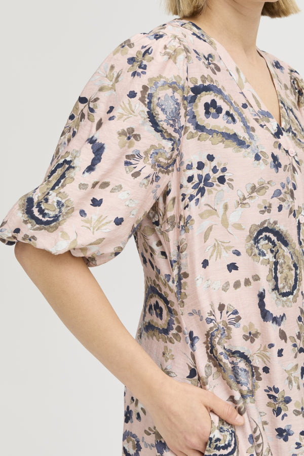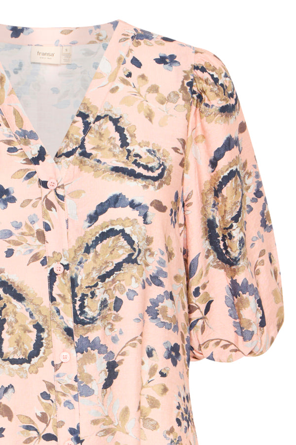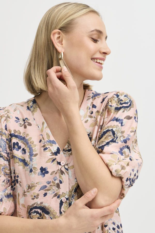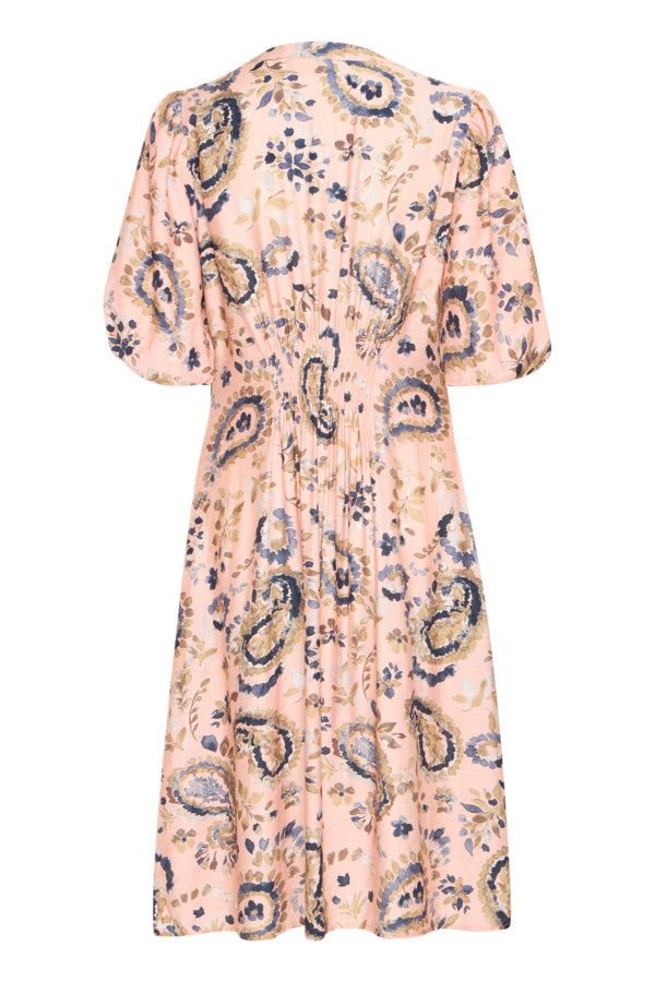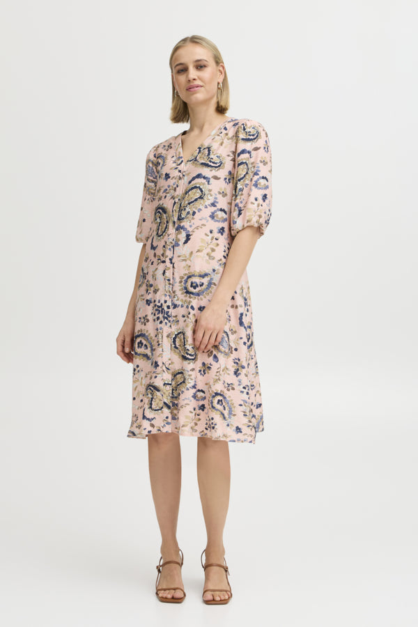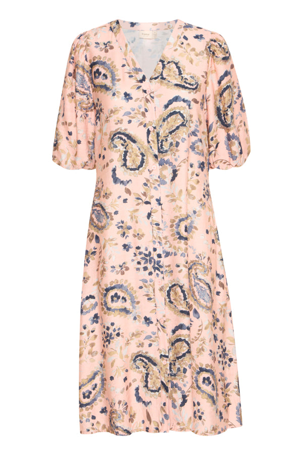 FRARIANA Dress fra Fransa er en vakker kjole i rosa med et delikat mønster som gir et friskt og feminint uttrykk. Kjolen har en regular fit som sitter godt på kroppen og har en knelengde som gir en elegant silhuett. De albuelange ermene gir en fin balanse mellom komfort og stil, og den lette viskoseblandingen gjør den behagelig å ha på hele dagen.
