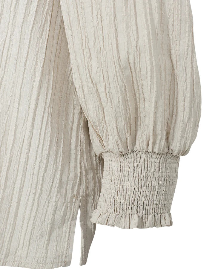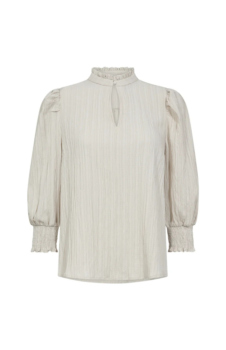 Bluse fra Freequent. 3/4 lange ermer, med strikk. Blusen har en liten krage, med en knapp øverst.