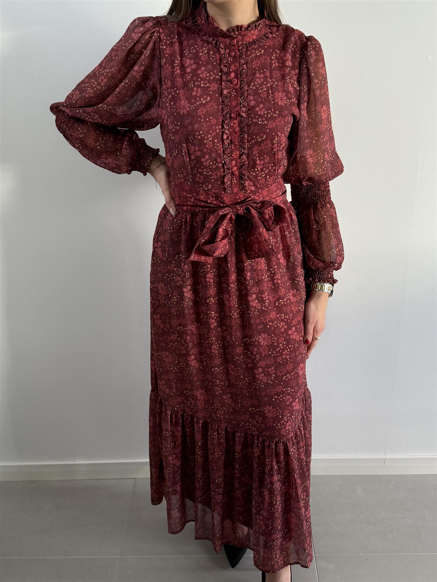 Den har knappedetaljer fremme, lange puffermer og en markert midje.