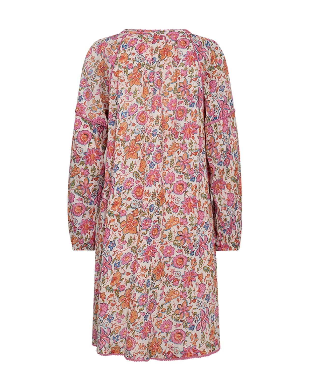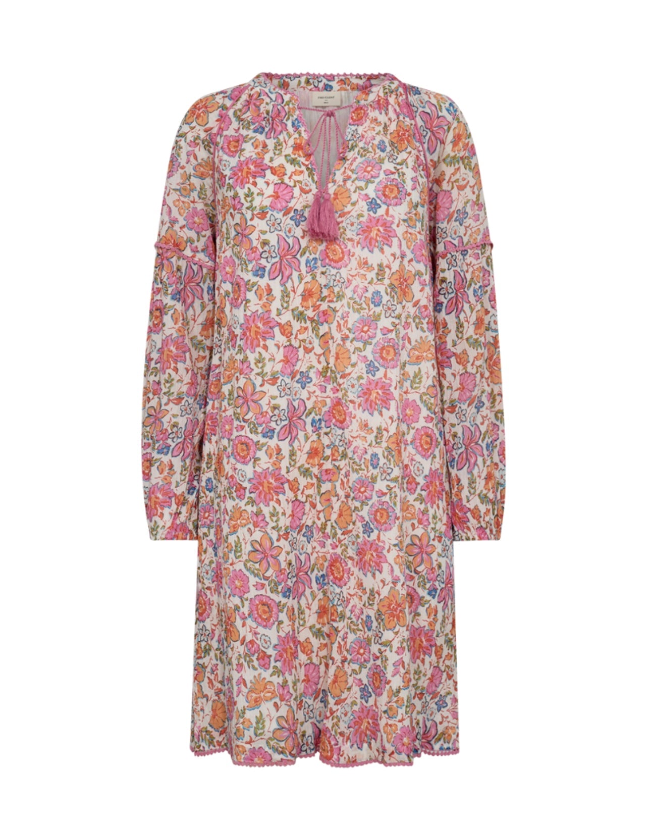 Carin Floral Dress fra Freequent er en feminin og elegant midi-kjole laget i fin bomullscrepe, med et vakkert blomstermønster som tilfører et romantisk preg. Kjolen har lange ballongermer og en V-hals med et heklet kantbånd og knytebånd med frynser, som gir et sofistikert og unikt uttrykk.