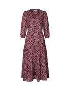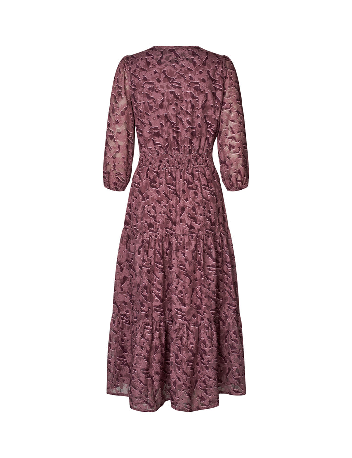 Lang kjole fra MbyM med nydelig farge og print. Innsvingt midje, med strikk bak. Knapper øverst på midjen av kjolen og 3/4 lange ermer.