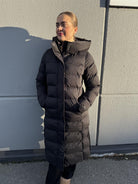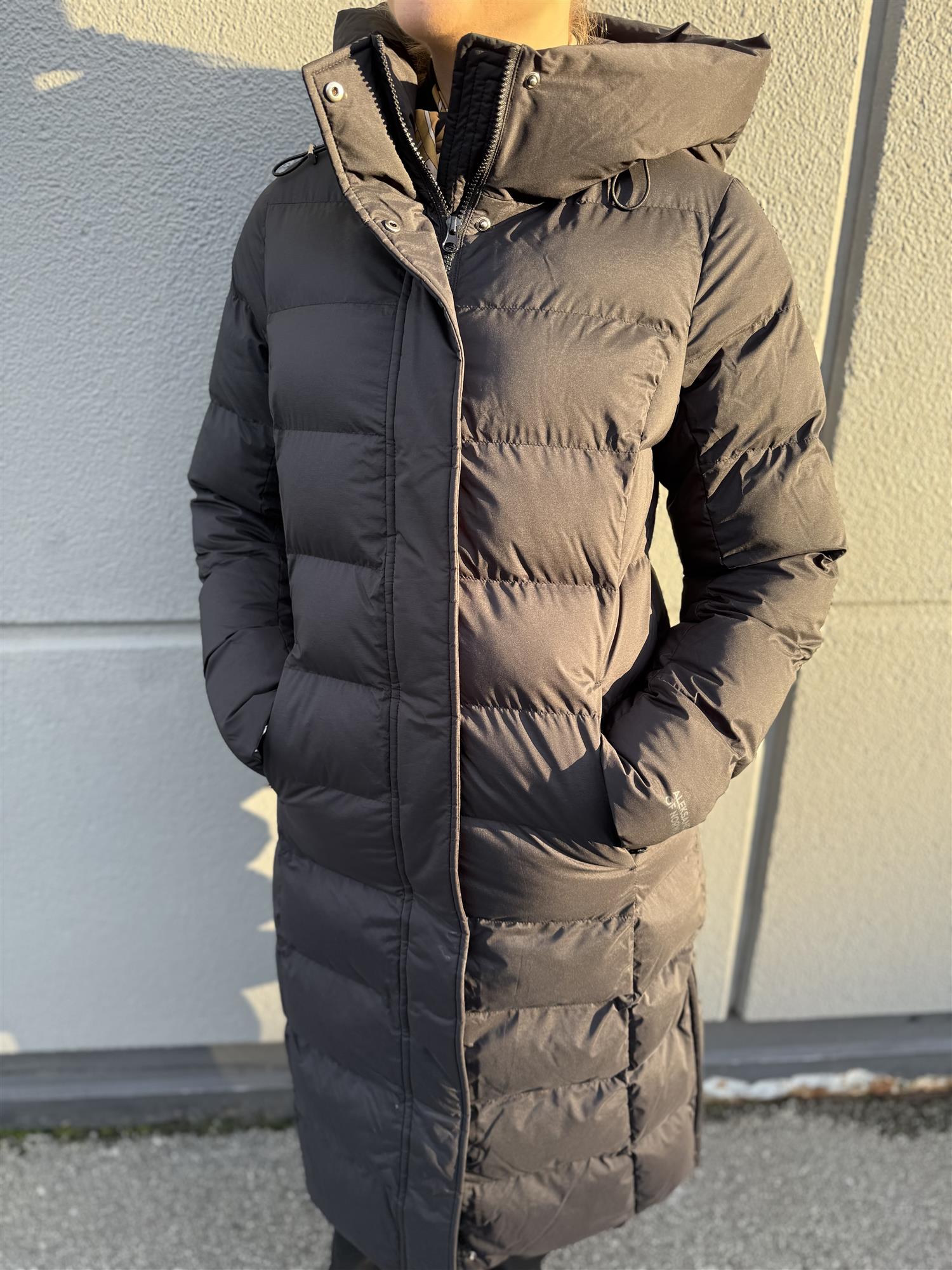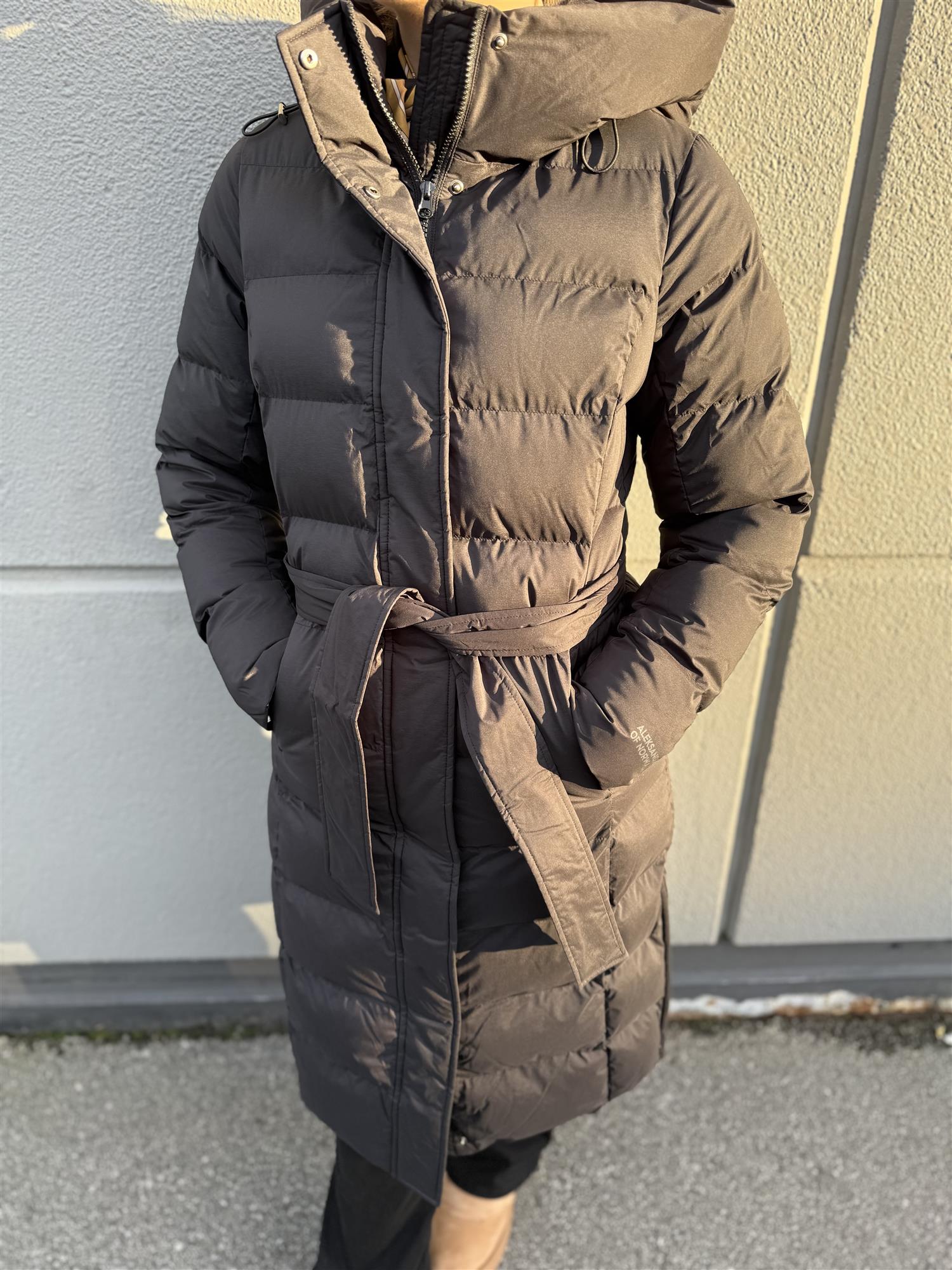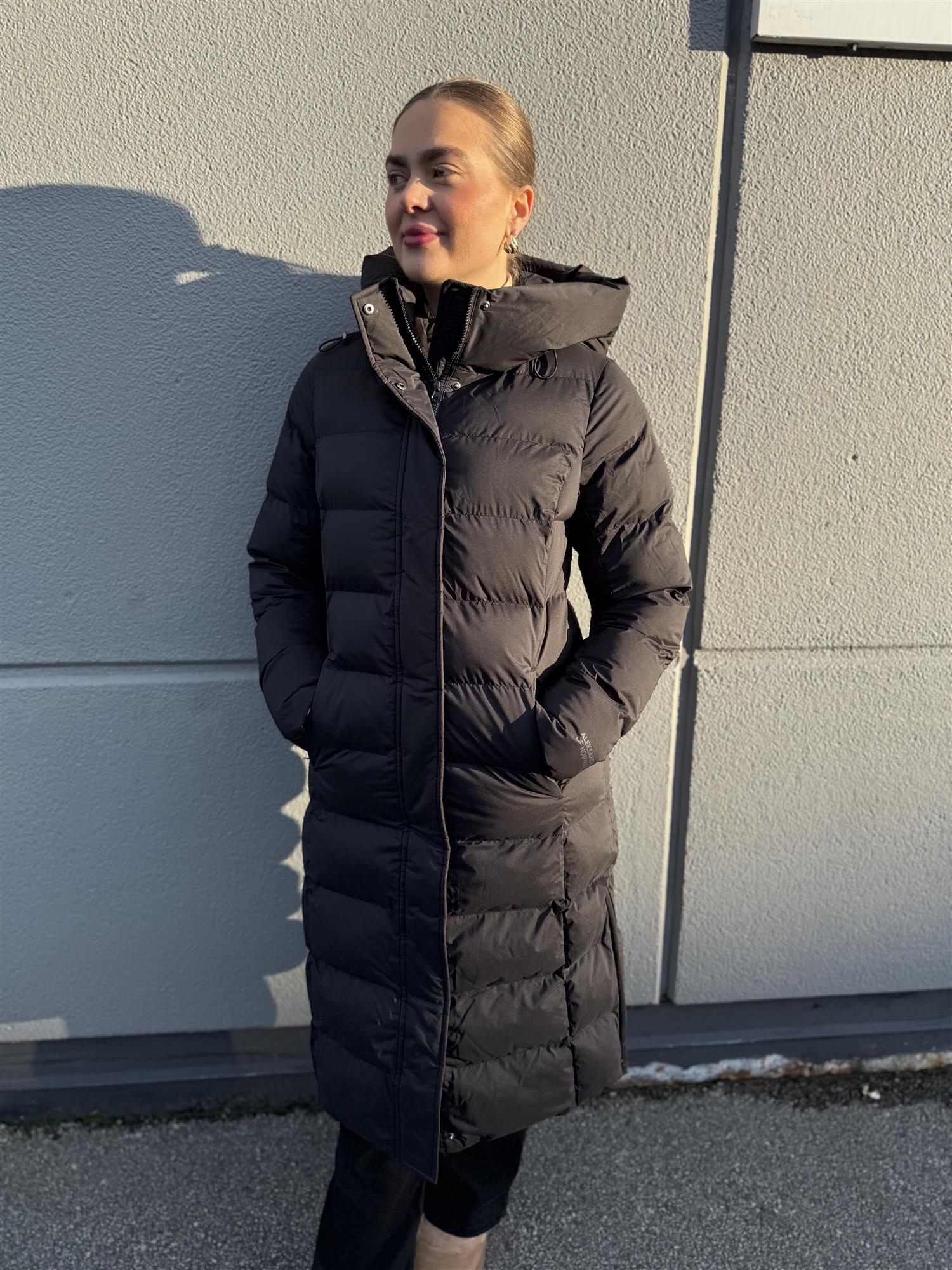 Boblekåpe fra Aleksander Of Norway. Rina jakken, er en tykk, lett og varm teknisk boblejakke i figursydd fasong. Den er lettvektig med varmeisolasjon. Jakken har en vannsøyle på 10.000 mm og er vindtett. Jakken har en tykk og god hette og et belte som knytes i livet. Jakken lukkes med glidelås i front, har glidelås i lommene og tapede sømmer. Foringen er laget i Sorona som er et delvis plantebasert materiale. Den har høy slitestyrke, er smussmotstandig, ekstra myk og lett.