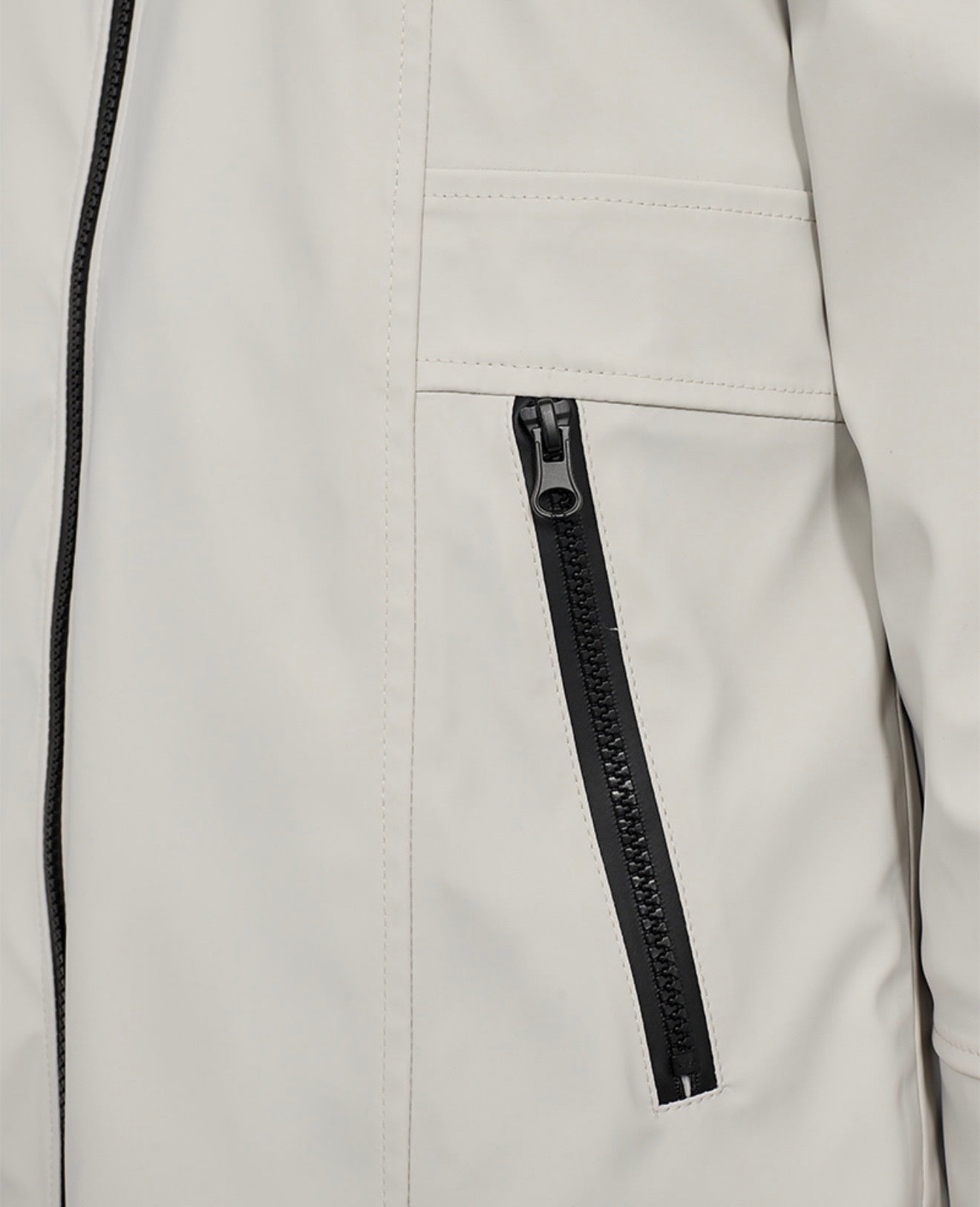 Den er designet med høy krage og hette som beskytter godt mot vær og vind, samt glidelåslukking i front. Lommer med glidelås gir et funksjonelt og gjennomført preg. En tidløs regnjakke som enkelt kan styles over både hverdagsantrekk og jobbklær.