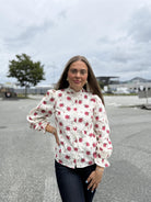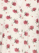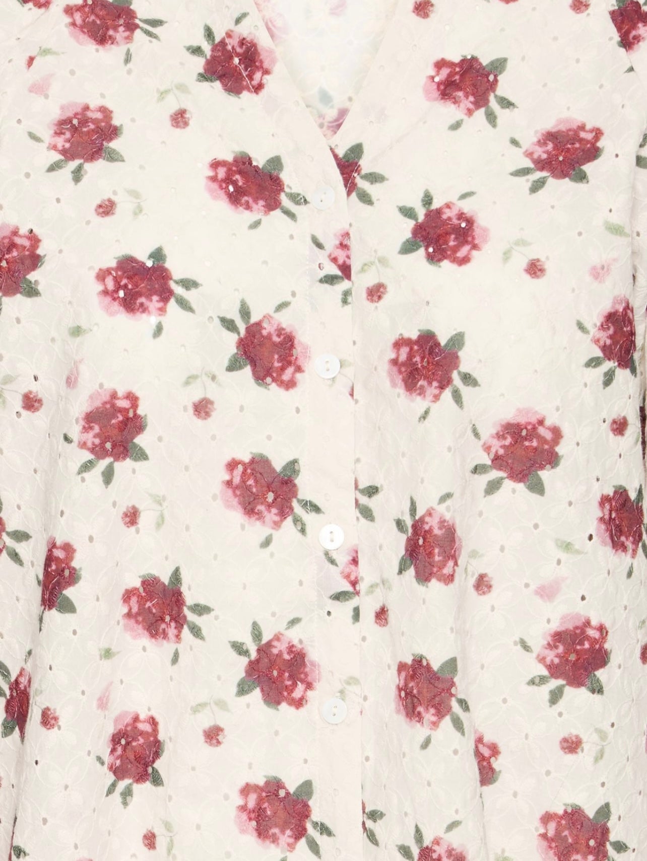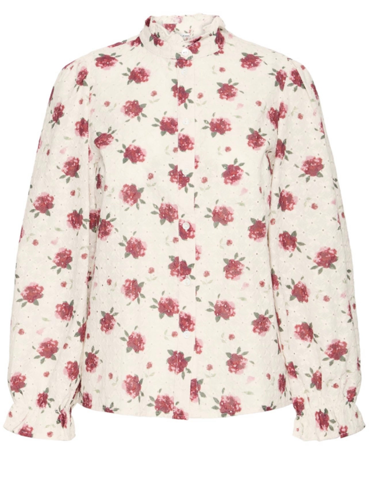 Nydelig bluse med struktur, blonder, puffermer og rose-mønster.