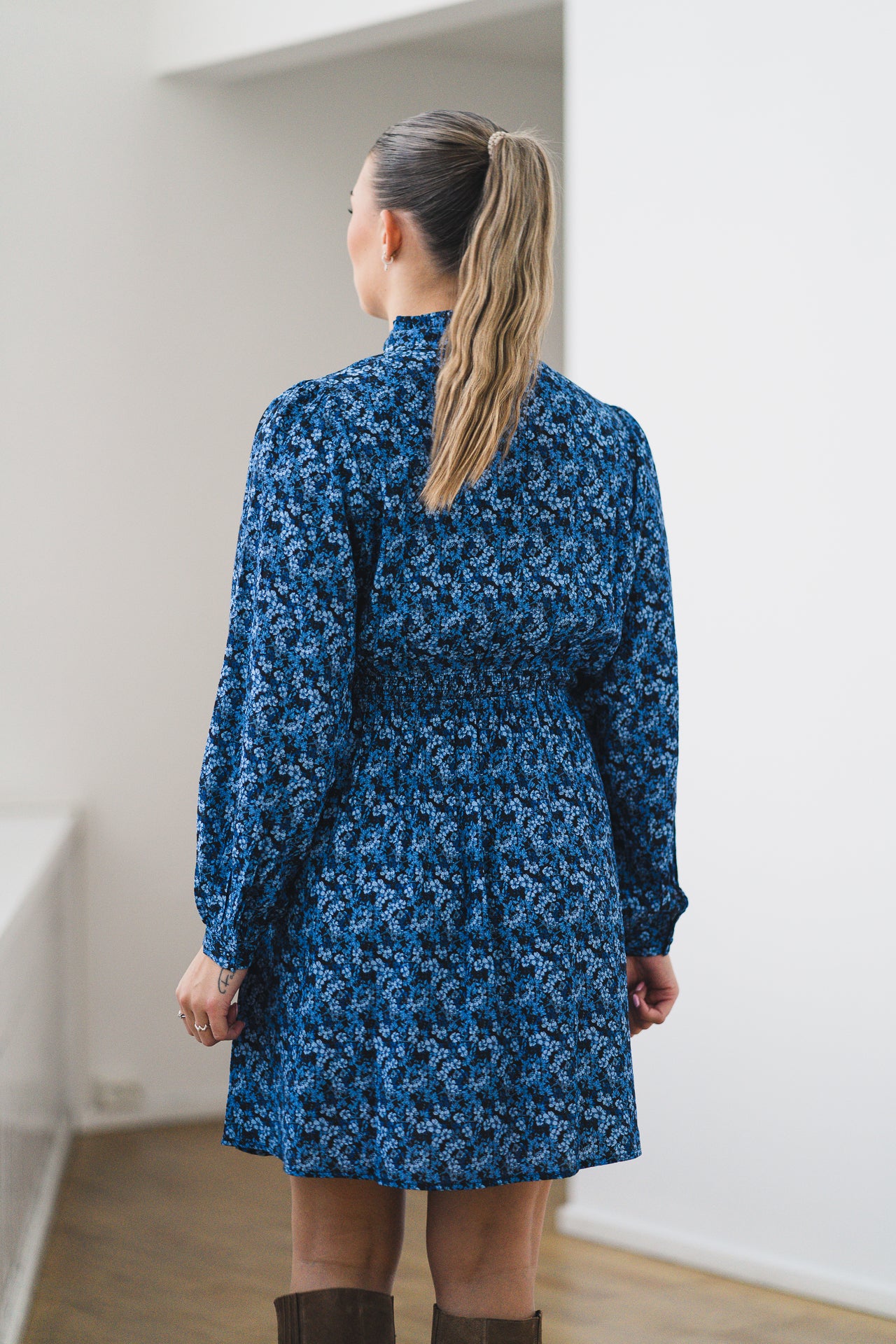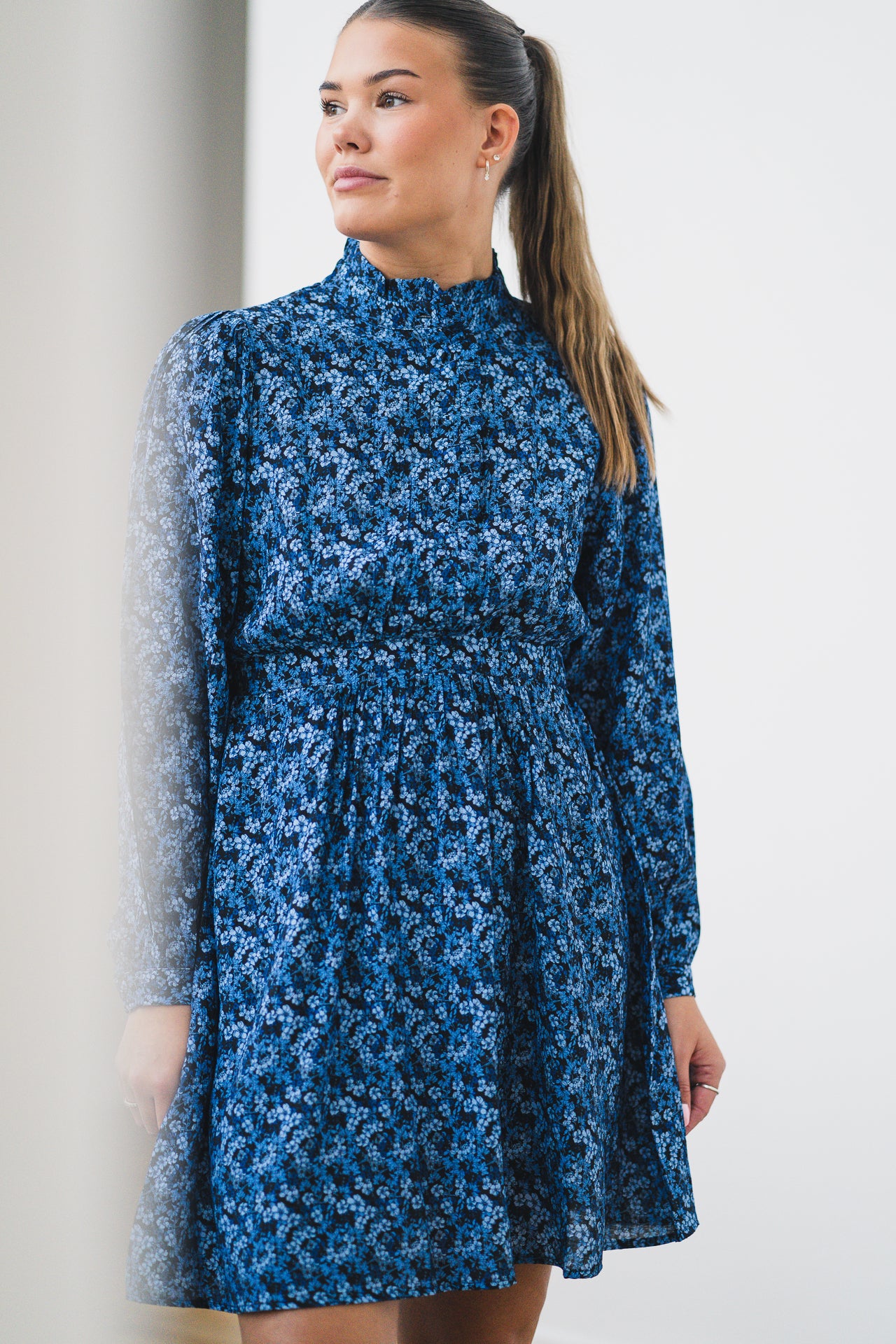 Kjole fra Raus utstråler en uimotståelig sjarm med sitt nydelige blomsterprint. Denne kjolen kombinerer en kort og flatterende lengde med lange ermer og en markert midje, som er justert med strikk på baksiden for å fremheve figuren. Den sjarmerende prestekragen med volanger og de delikate knappene på kragen tilfører et lekent og feminint preg, mens det friske blomstermønsteret i blått farge gir kjolen et elegant utseende. Laget i en blanding av viskose og polyamid, føles kjolen meget myk og behagelig mot huden.