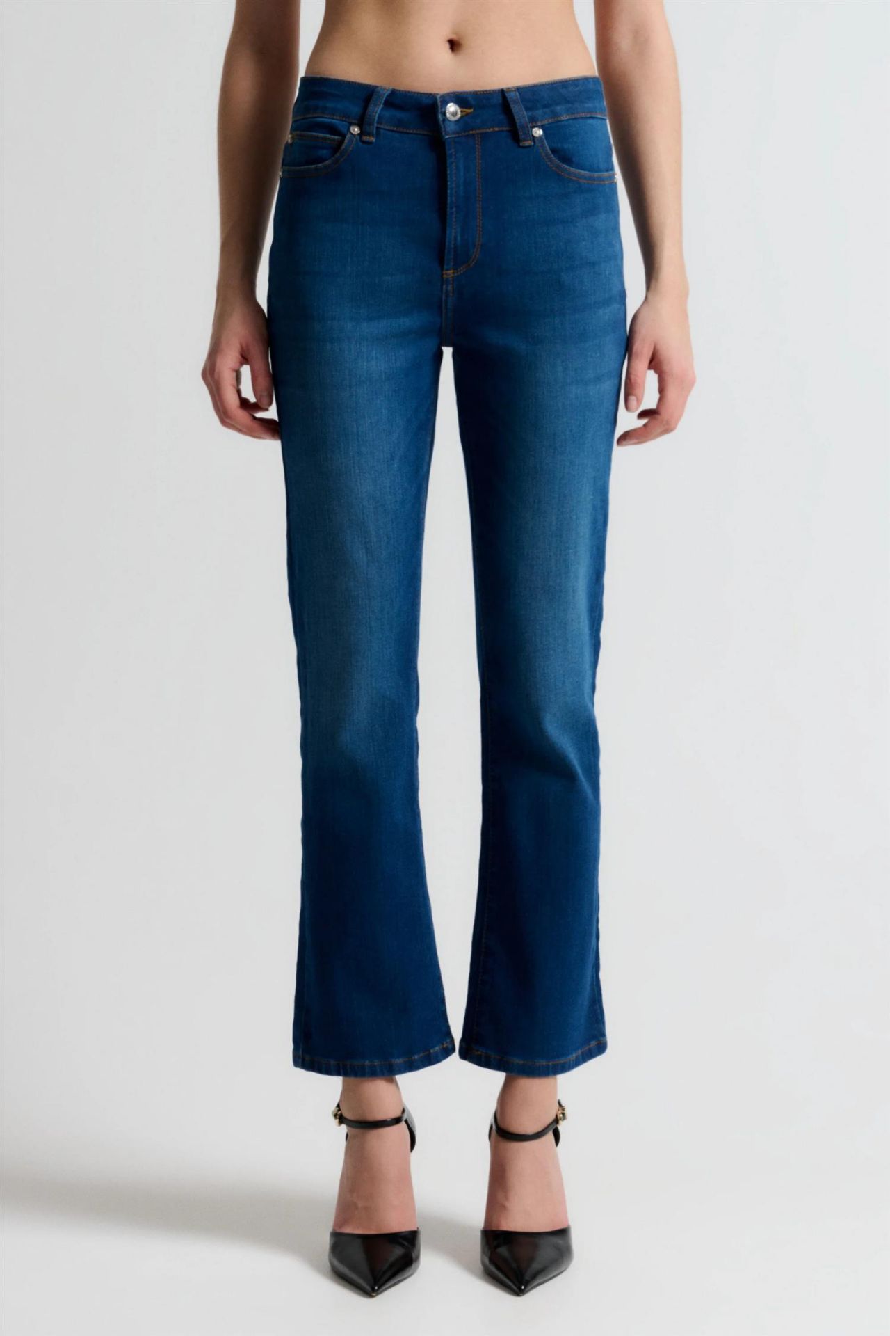 Johanna jeans i en medium denimblå vak med skinny passform, midje i middels høyde og avkortet utsvinget ben.