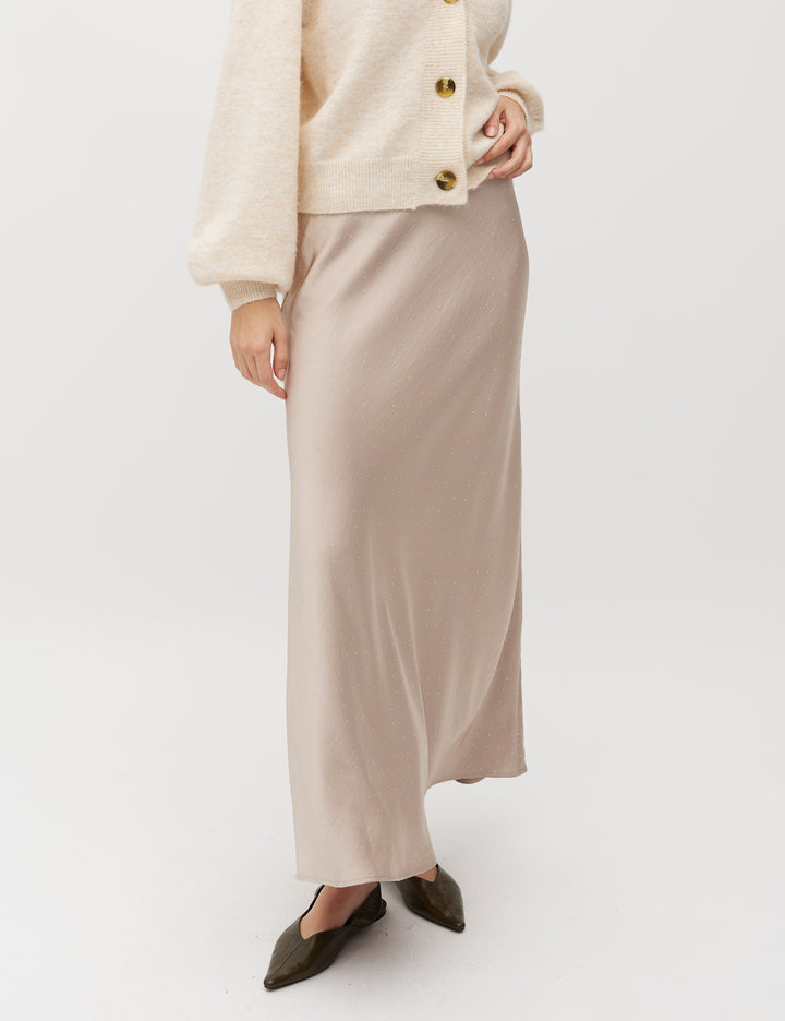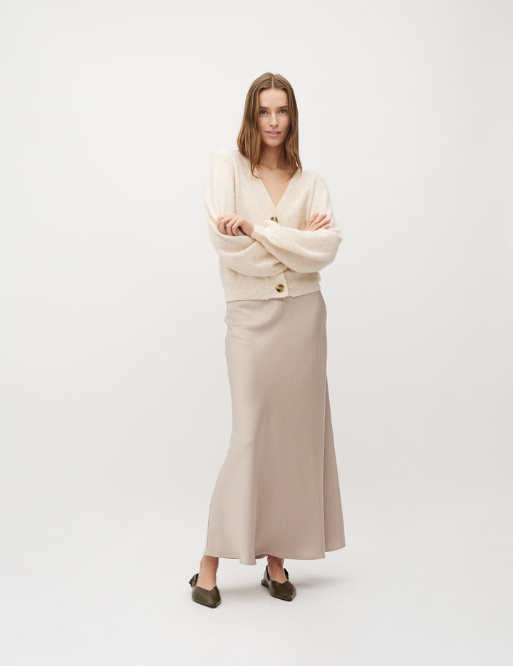 Fargen gjør skjørtet tidøst og enkelt å kombinere med både lysere og mørkere overdeler. Skjørtet kan også styles sammen med matchende topp fra MbyM.