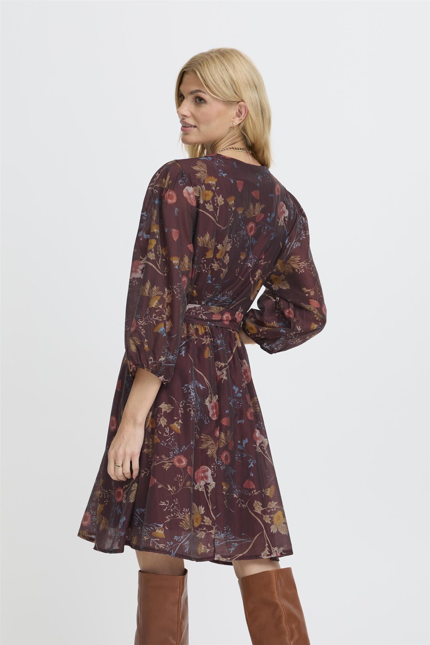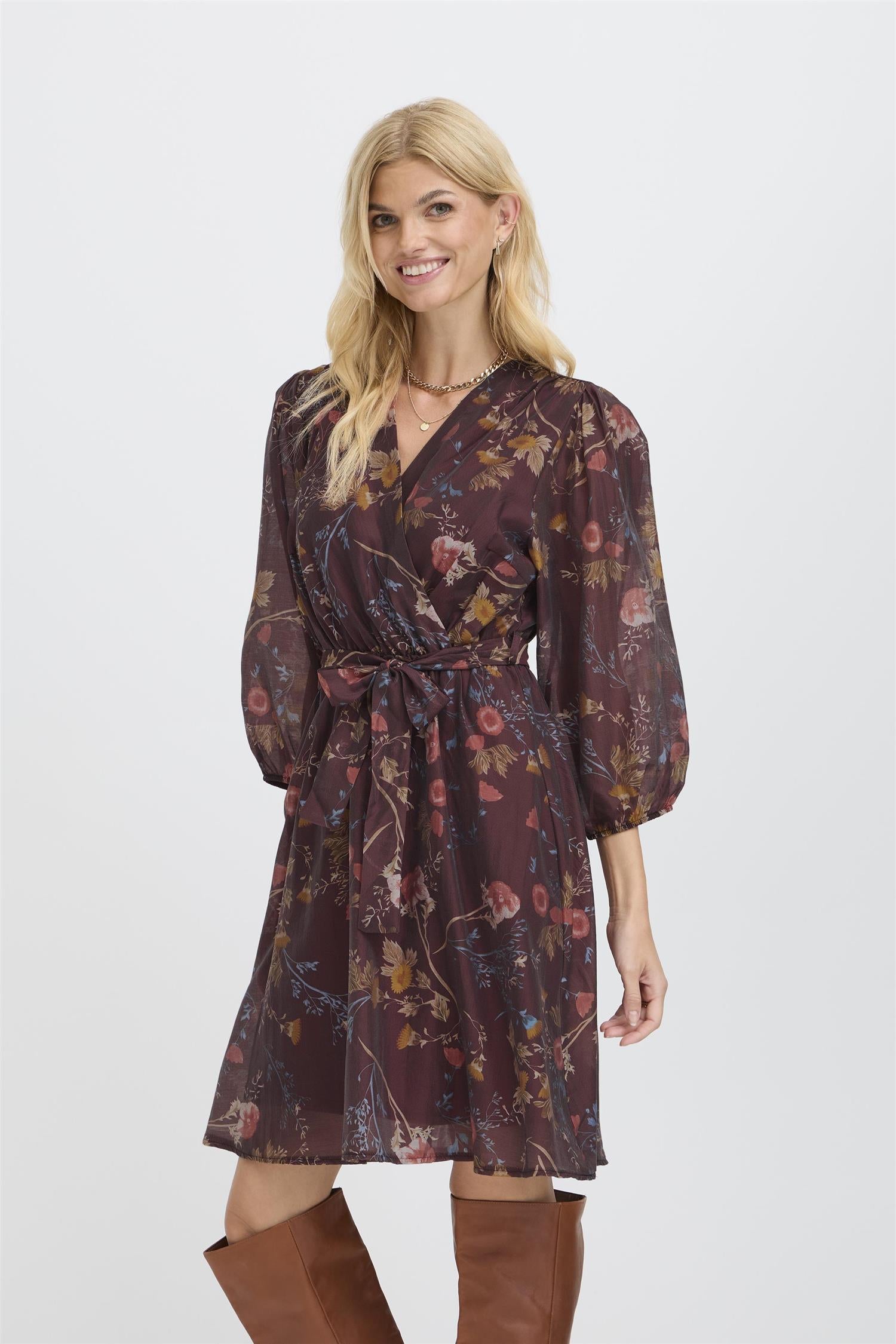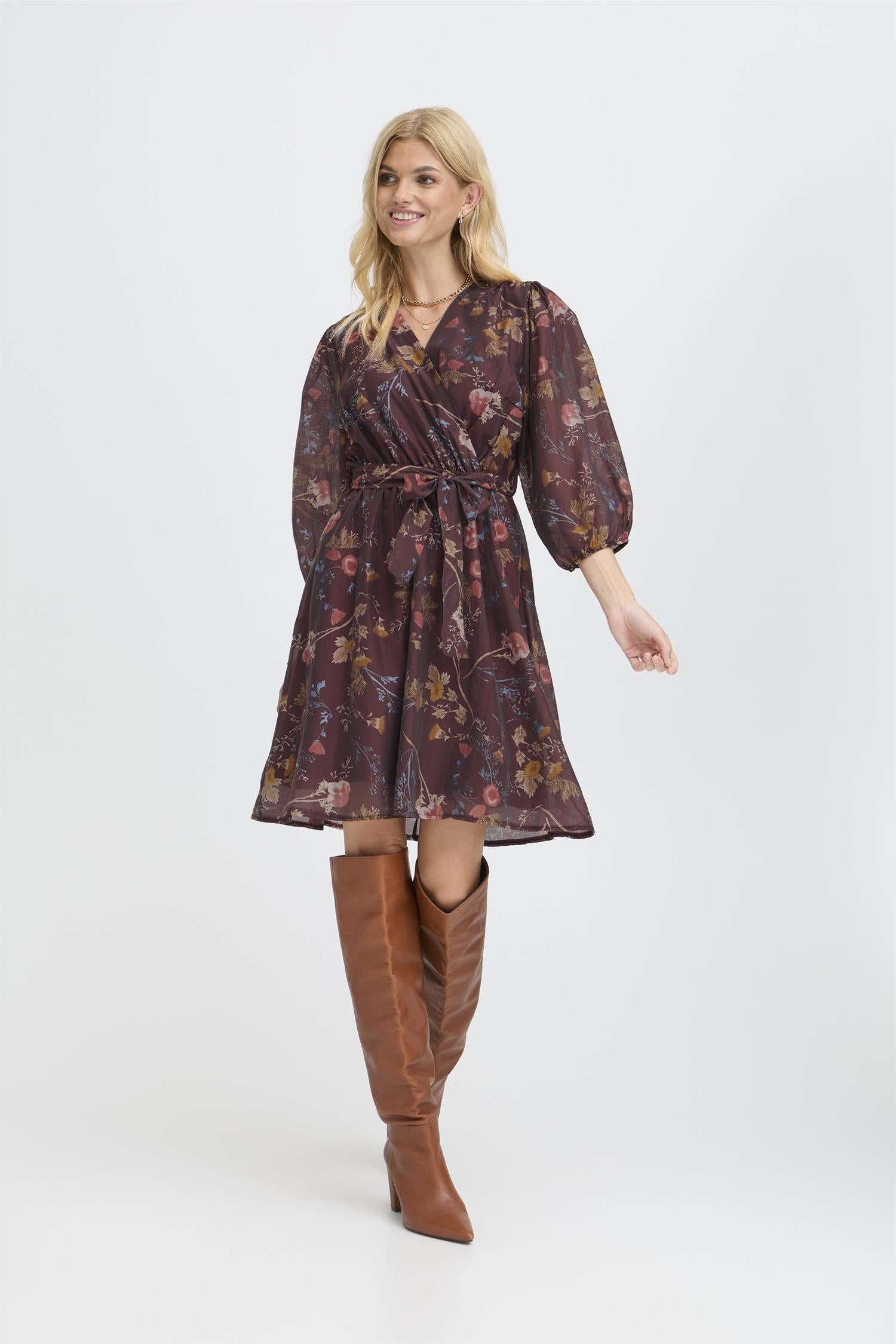 Kjole fra Sorbet med blomster print. Kjolen har 3/4 lange ballongermer. Knyting i midjen.