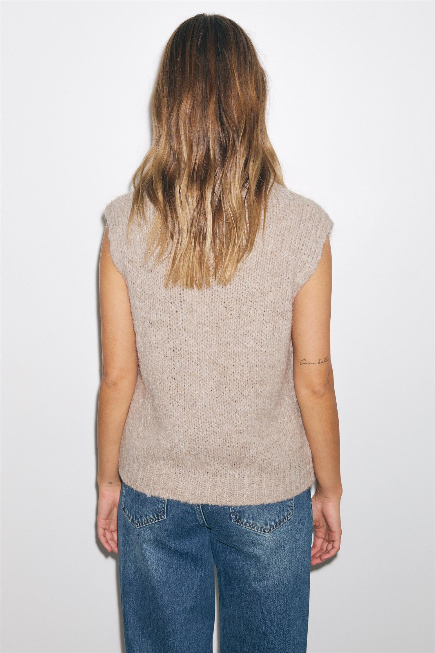 Deilig og myk strikkevest. Vesten har en ribbestrikket hals og kant for struktur.
