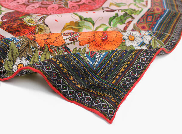 Eksklusivt silkeskjerf med håndsydd rulle-søm.