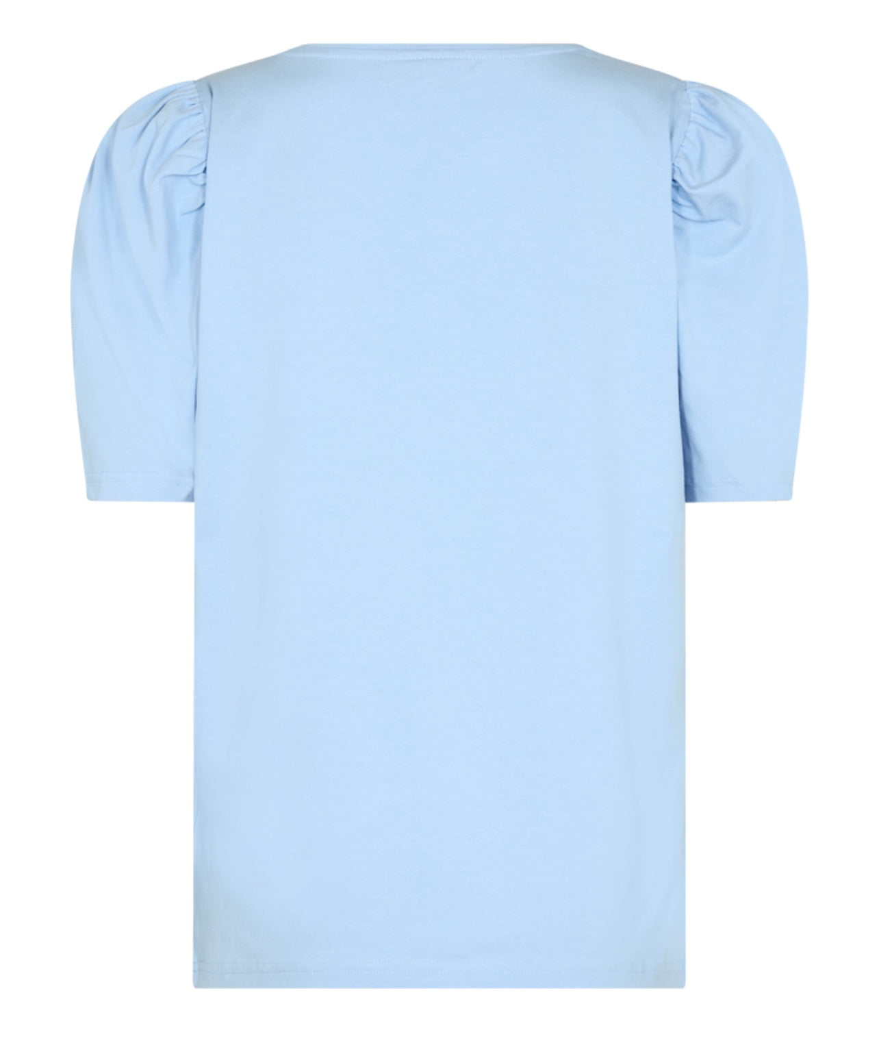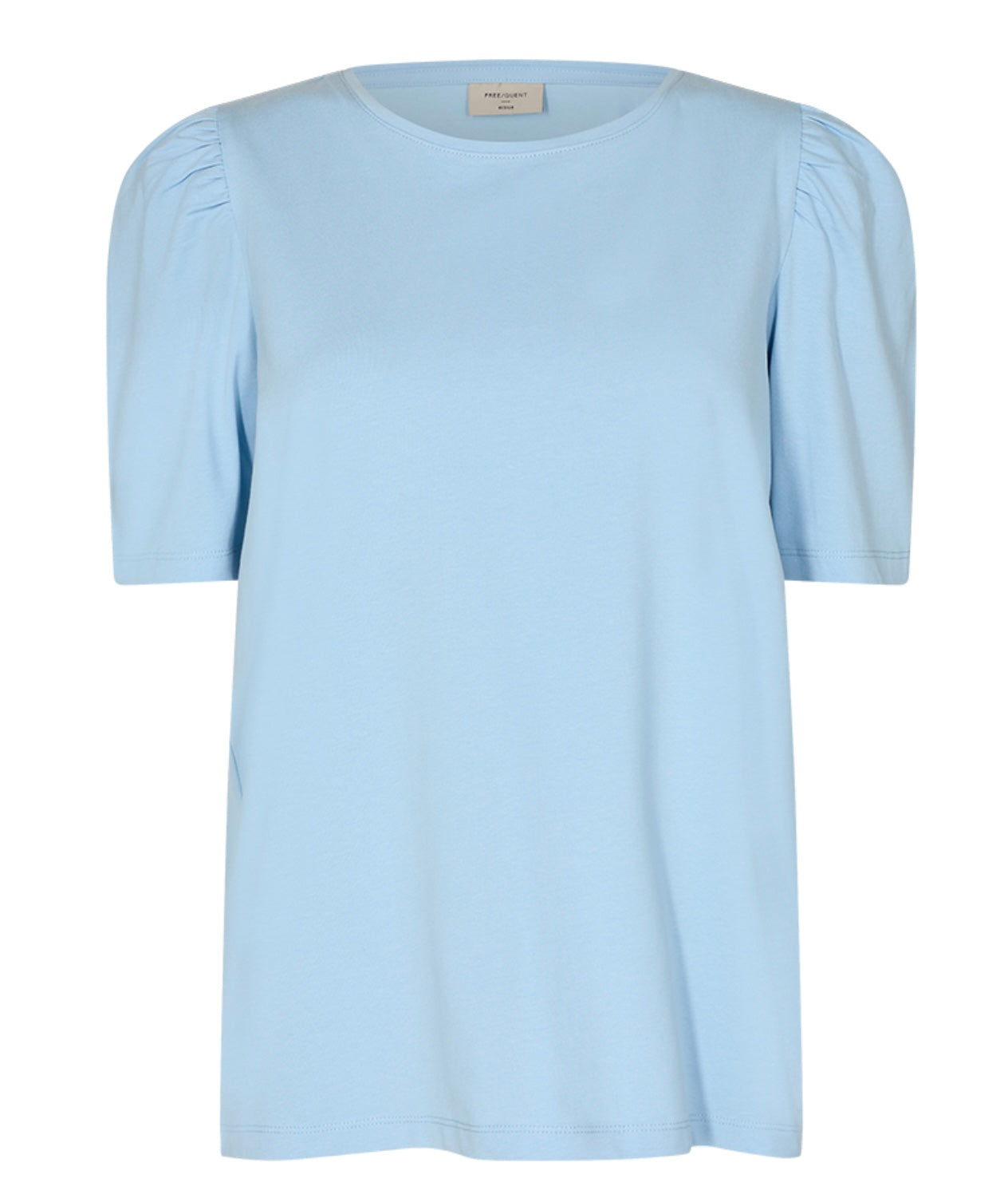 En T-skjorte fra Freequent, laget i et mykt materiale. Denne T-skjorten har en enkel silhuett med korte puff-ermer, en avrundet halslinning med ribbekant, samt en avslappet passform.