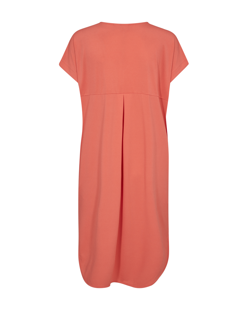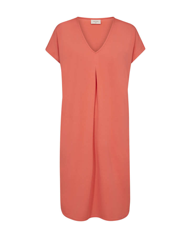 Kjolen fra Freequent er laget av et mykt materiale. Kjolen har en enkel silhuett med korte ermer, V-hals, en avslappet passform og front- og bakfolder som legger til et nydelig preg.