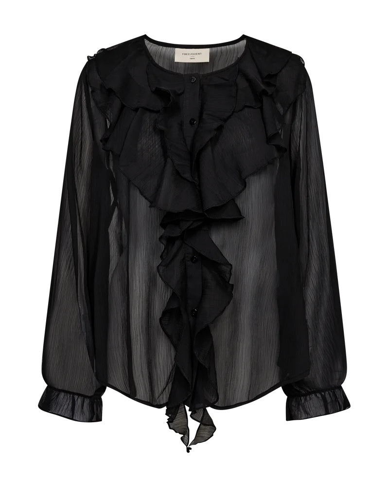 Bluse fra Freequent i et lett materiale. Blusen har en enkel silhuett med avrundet hals med knyting, lange ermer med elastiske mansjetter samt rysjedetaljer på brystet og ved knappelukkingen. Detaljer som kombineres for et feminimt utseende.