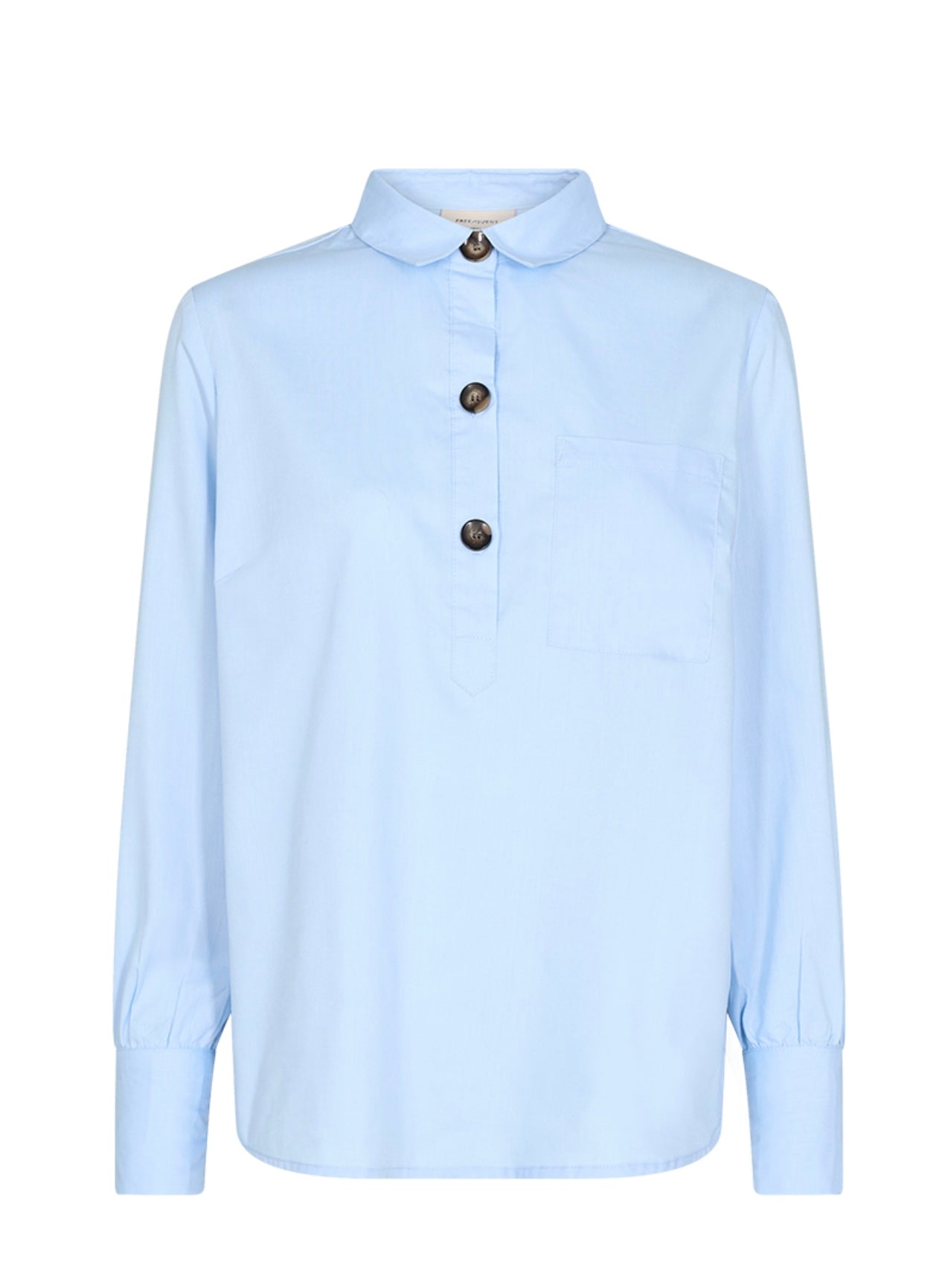 Flynn Shirt fra Freequent er en klassisk og tidløs skjorte med et moderne preg. Skjorten kommer i en lekker chambray-blå farge som enkelt kan styles til ulike anledninger. Den har en avslappet passform, pene knappedetaljer og mykt materiale som gir en behagelig følelse gjennom hele dagen.