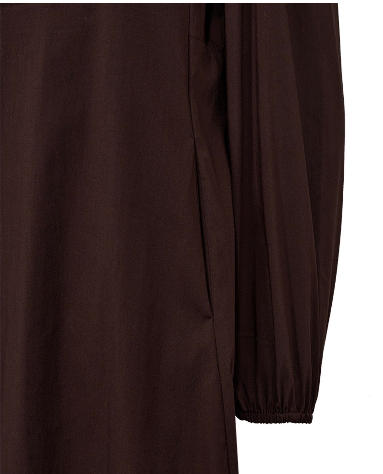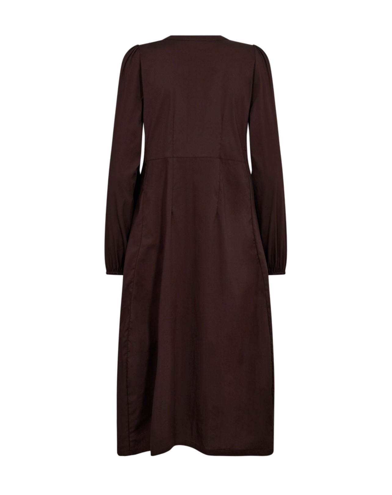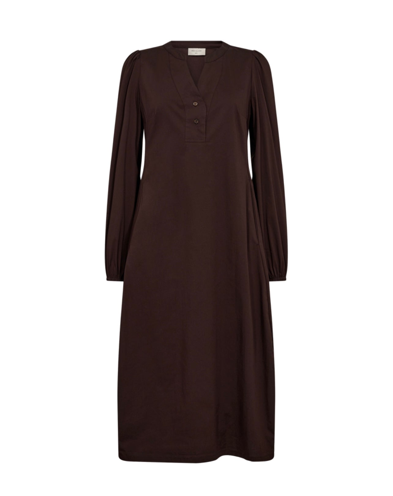 Røff og komfortabel midikjole med v-hals, strikk på håndledd og lommer i sidene. Kjolen er innsvingt nederst.