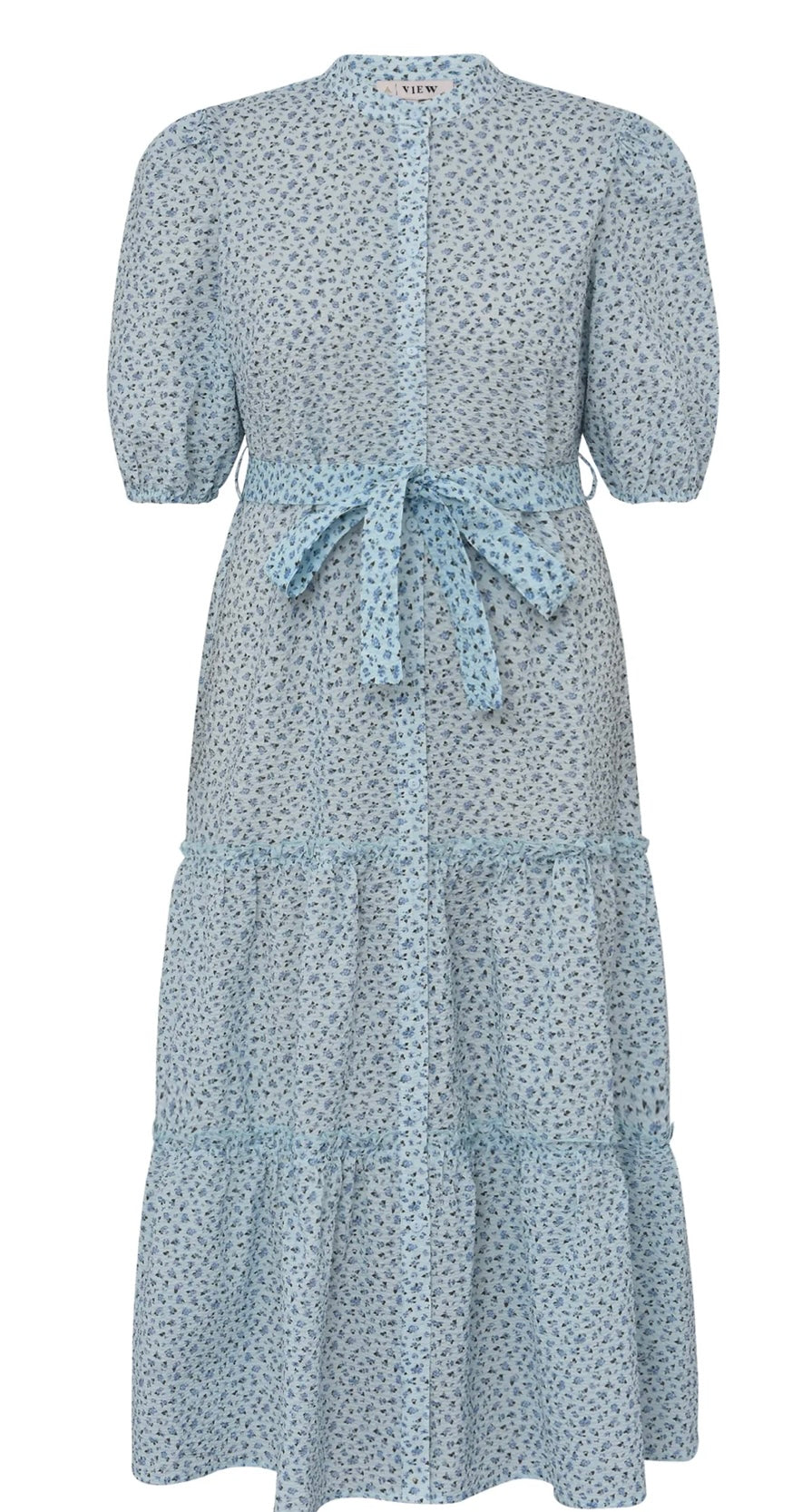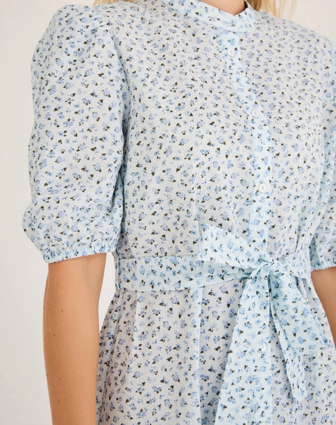Kate Long Dress er en kjole i ankellengde laget av bomull av høy kvalitet med et blomstertrykk. Kjolen har et belte i midjen, korte puff-ermer og knappelukking foran.
