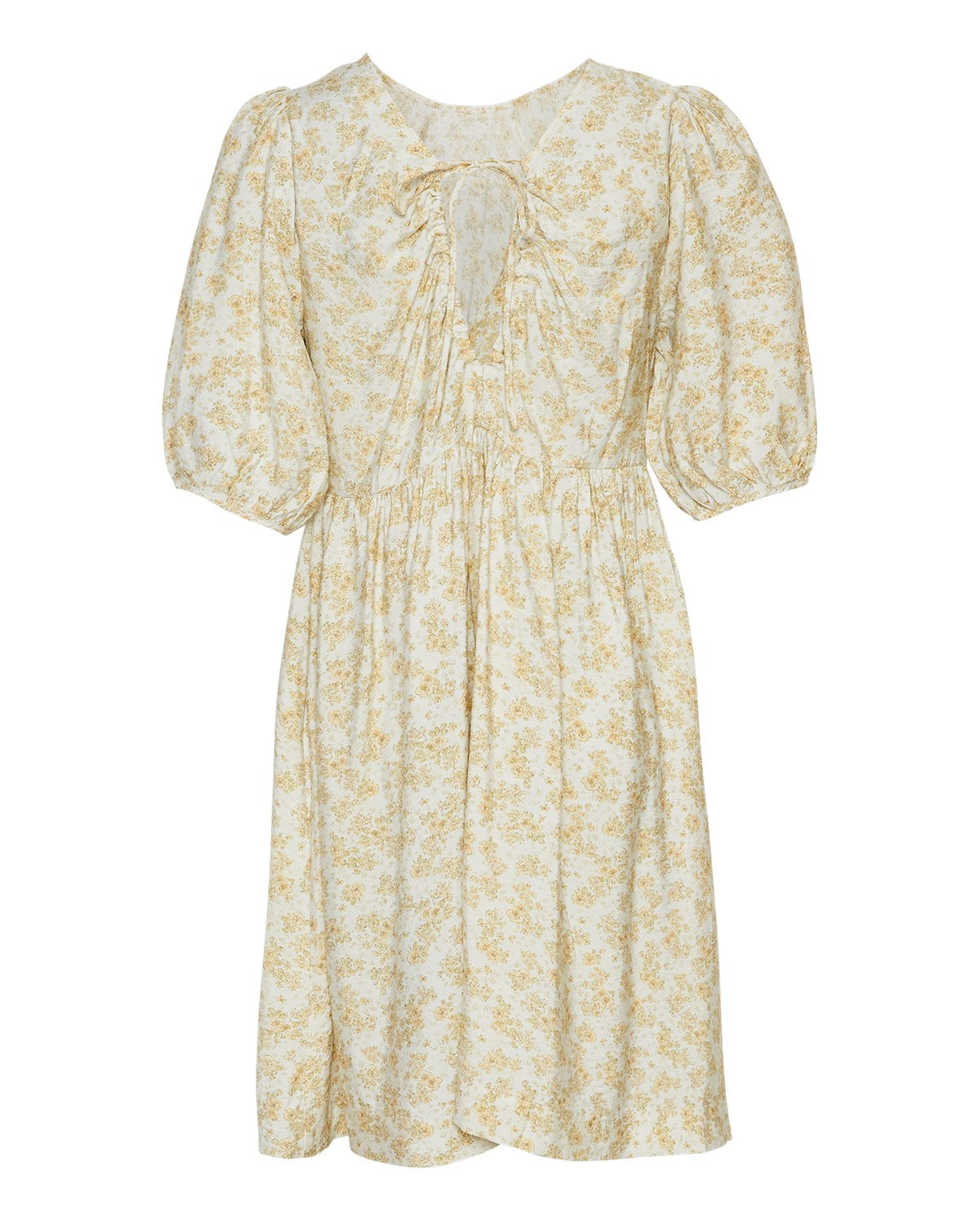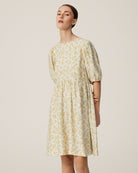 Marva-serien er en samling av stiler med et feminint, lysegult blomstertrykk. Kjolen har korte puffærmer, elastiske mansjetter og rund hals med sløyfedetaljer på ryggen. Kjolen kan dresses opp til en fin anledning eller brukes med flip-flops på varme sommerdager. Style den med hvitt eller beige for å matche nyansene i trykket, eller style den med blått for å gi litt kontrast.