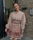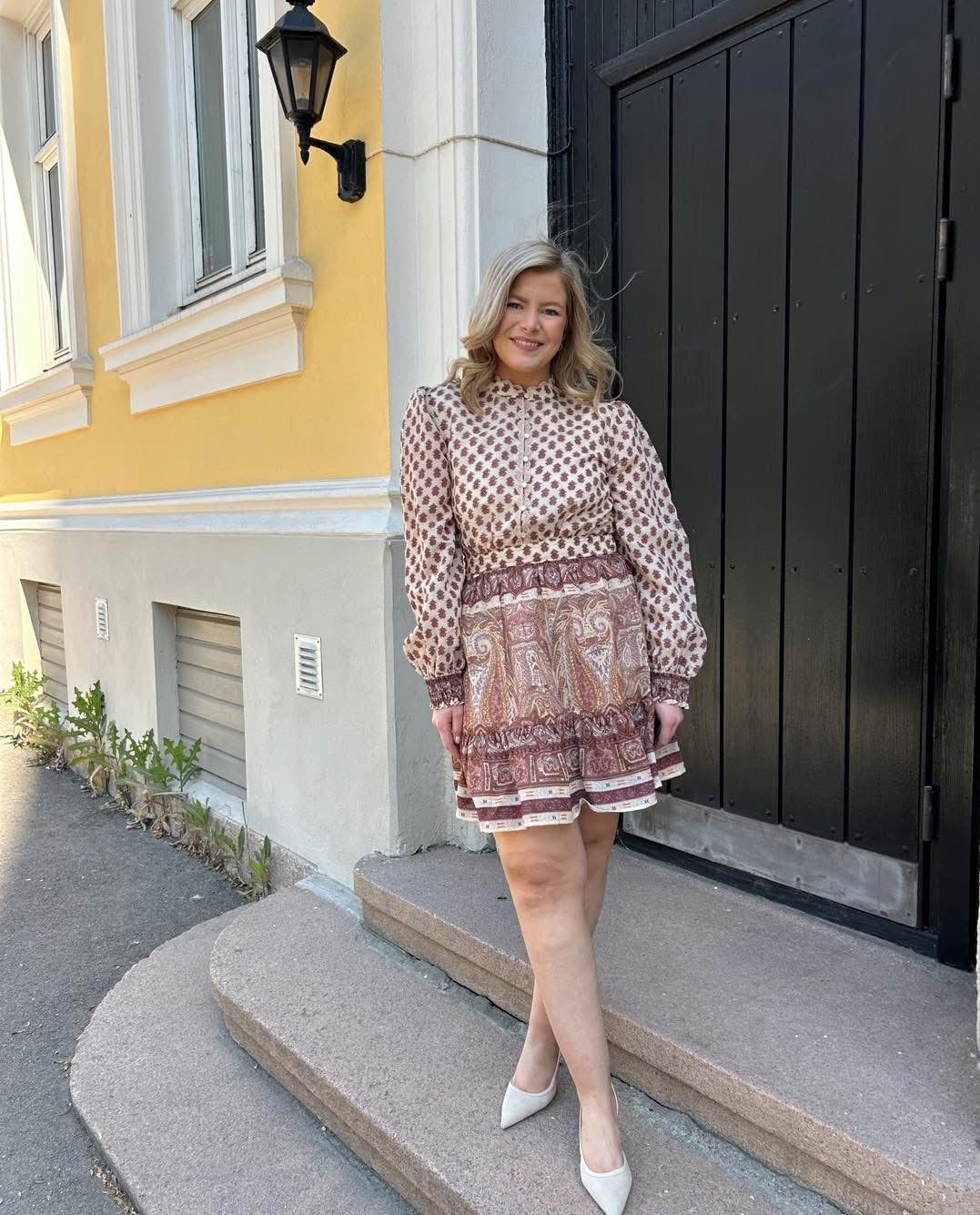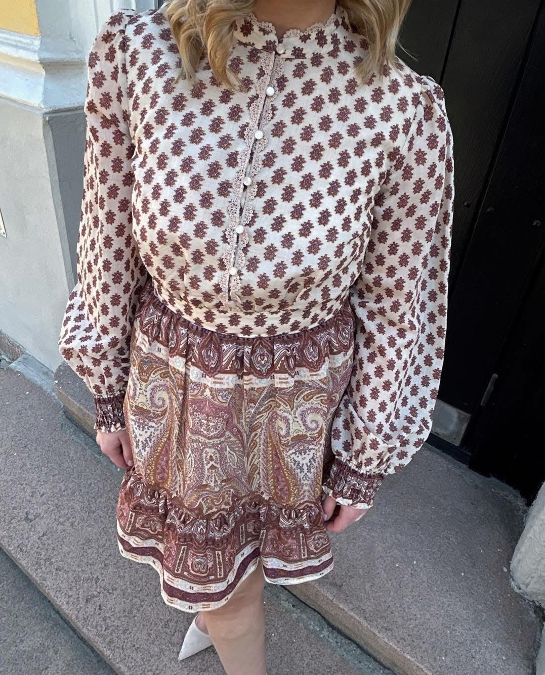 Super søt kjole i nydelig mønster. Kjolen har knapper i front, puffermer og strikk rundt håndledd, og i livet bak.