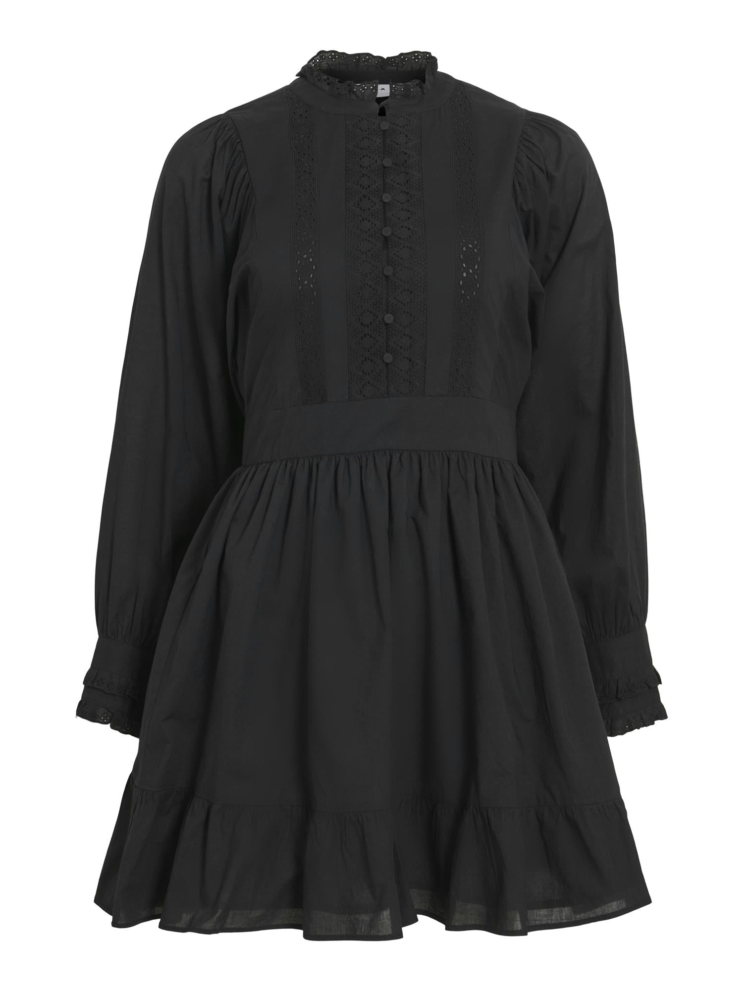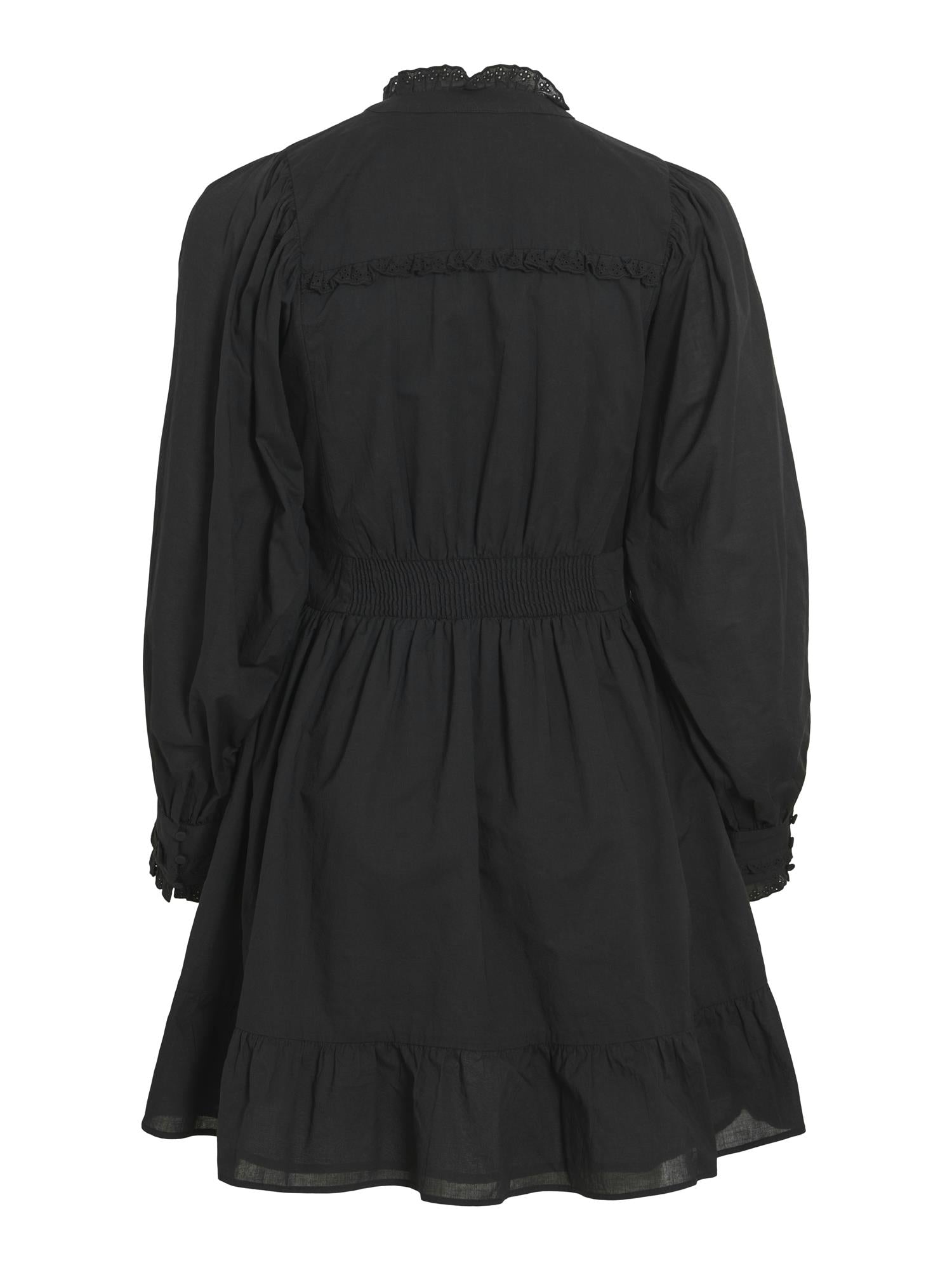 Denne søte kjolen kombinerer klassiske detaljer med en moderne vri. Med rund hals, voluminøse ermer og myke volanger får du en feminin silhuett, som passer like godt til hverdagsbruk som til spesielle anledninger.
