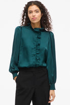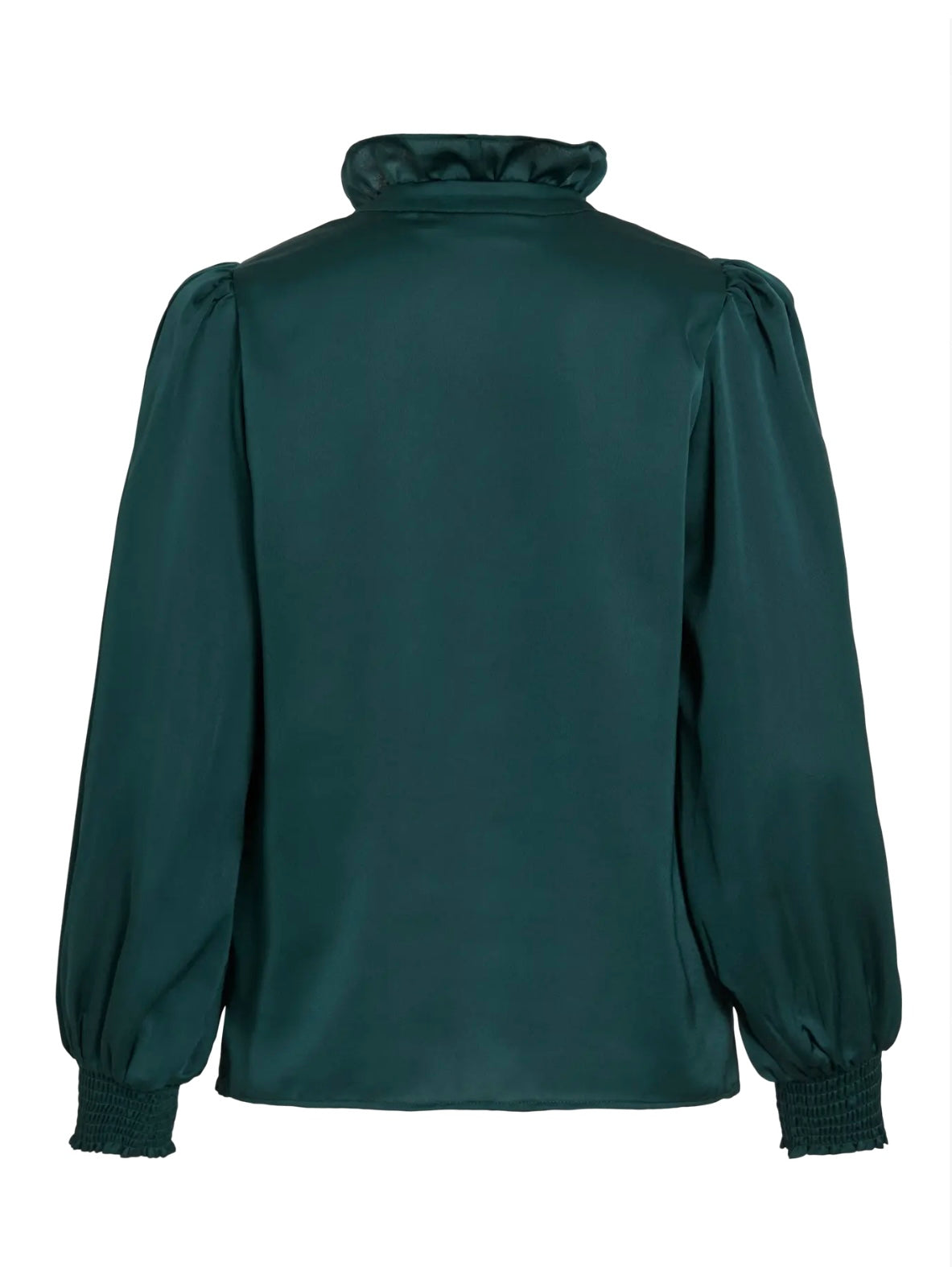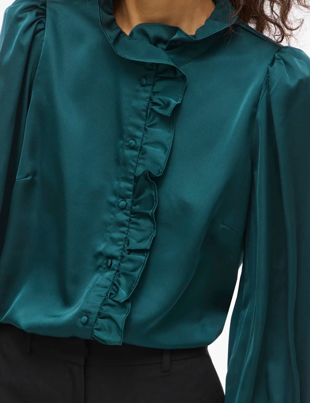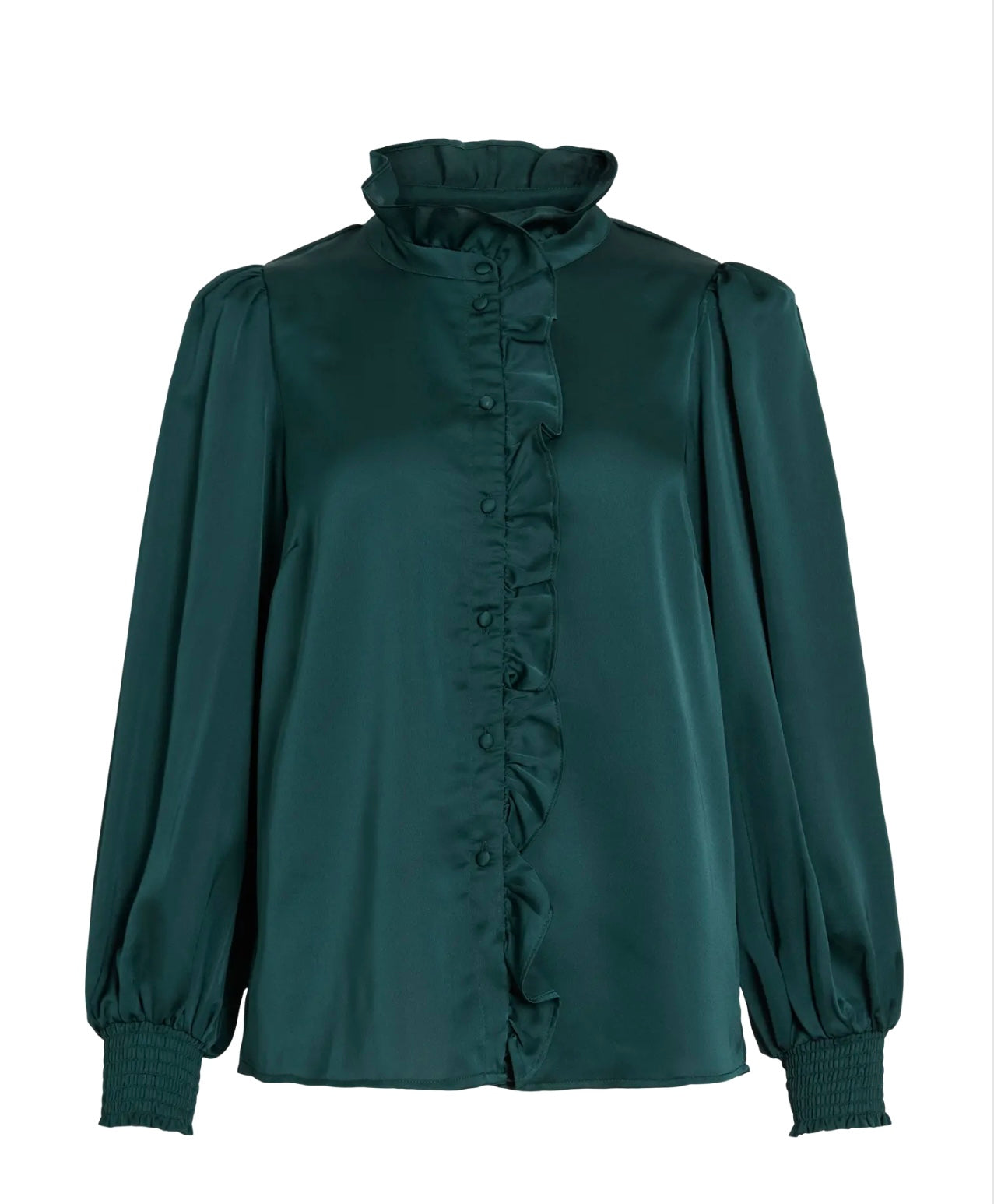 Lutto L/S Frill Shirt fra Vila er en feminin og elegant bluse med romantiske detaljer. Den har lange ermer med strikk i mansjettene, høy hals og dekorative volanger langs knappeåpningen foran. Blusen har en lett og luftig kvalitet som gir et sofistikert uttrykk – perfekt både til hverdags og fest.