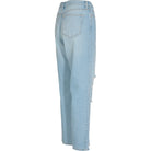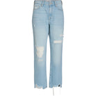 Buksen har middels høyt liv, cropped lengde, 5 lommer og slitte detaljer.