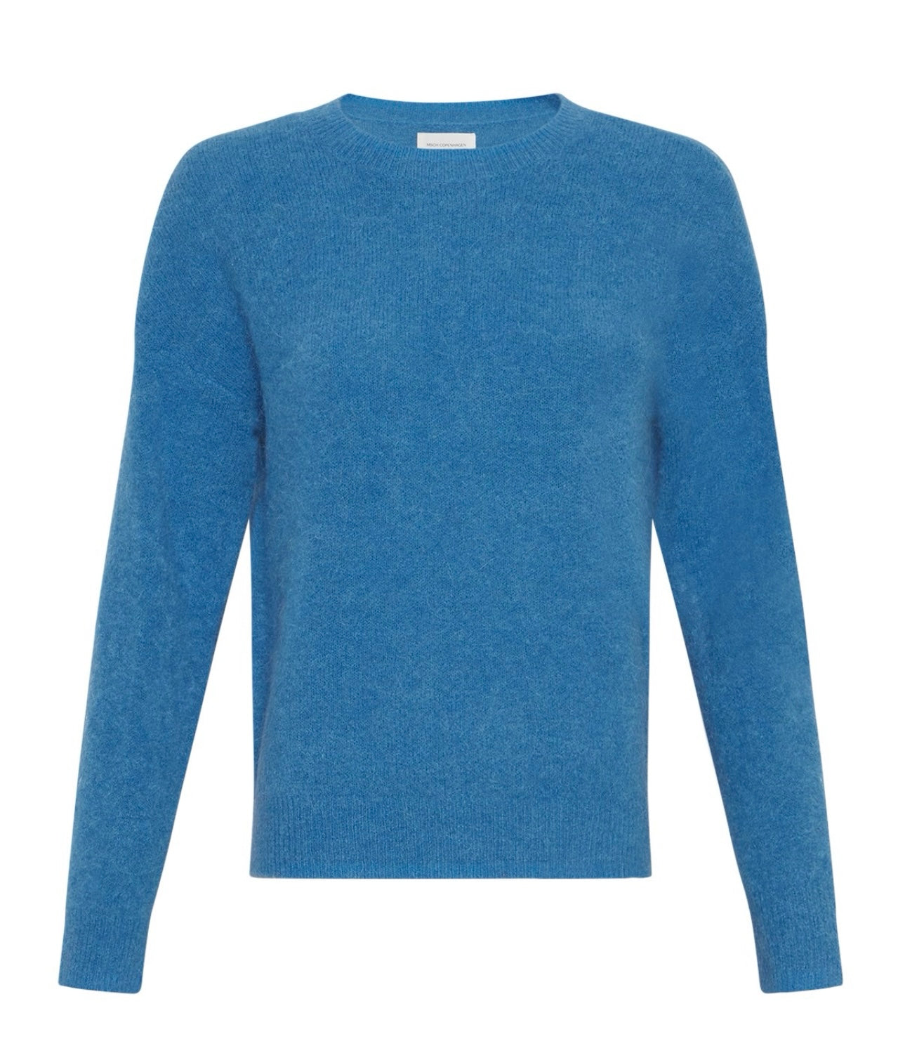 Genseren har en rund hals, rett passform og ribbestrikkede kanter.