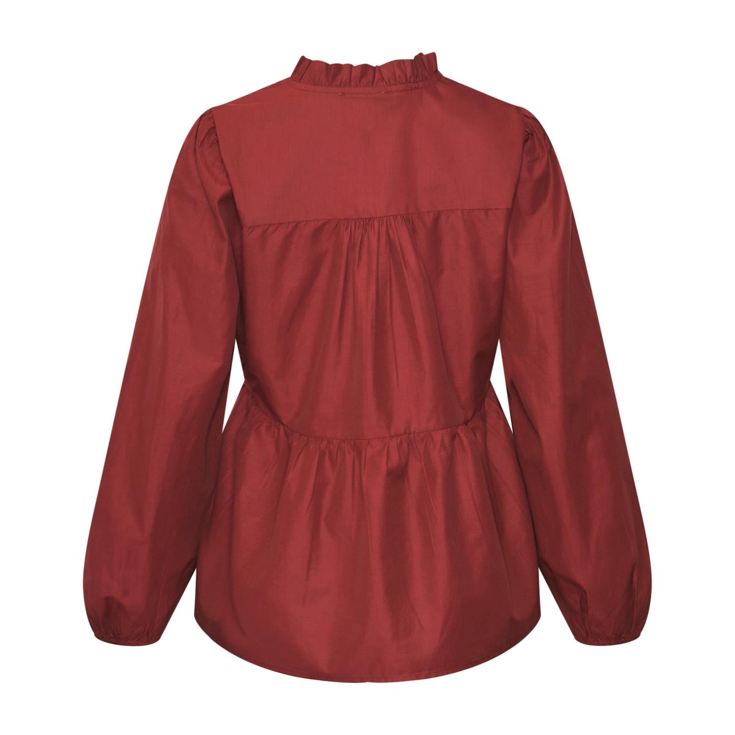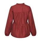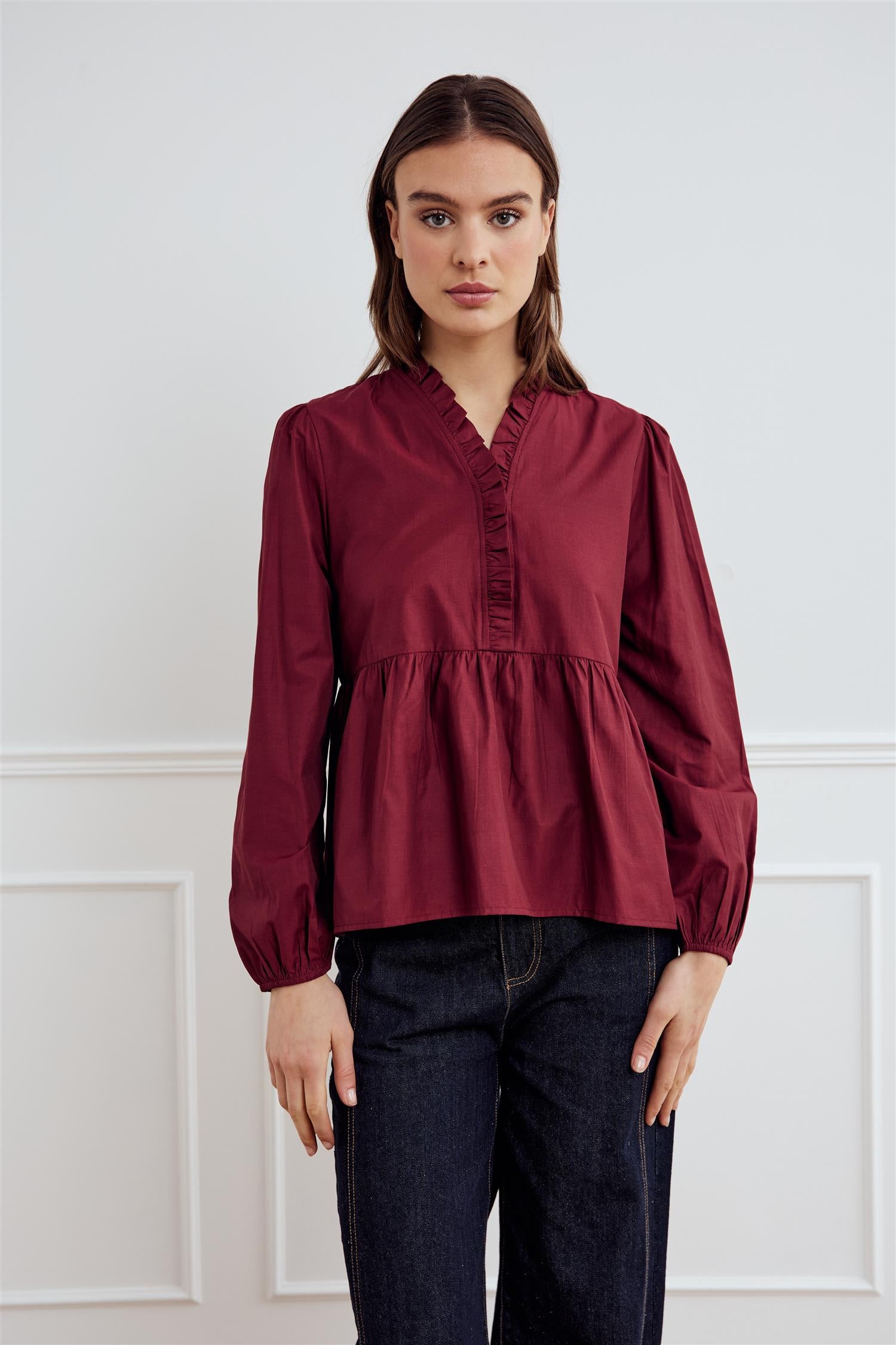 Denne elegante blusen har en flatterende V-hals utsmykket med delikate rysjer og strikk rundt håndledd.