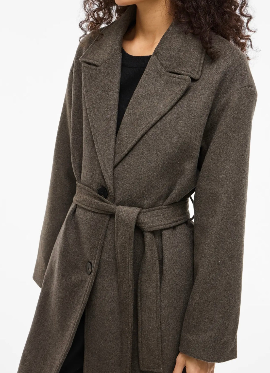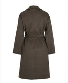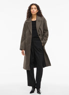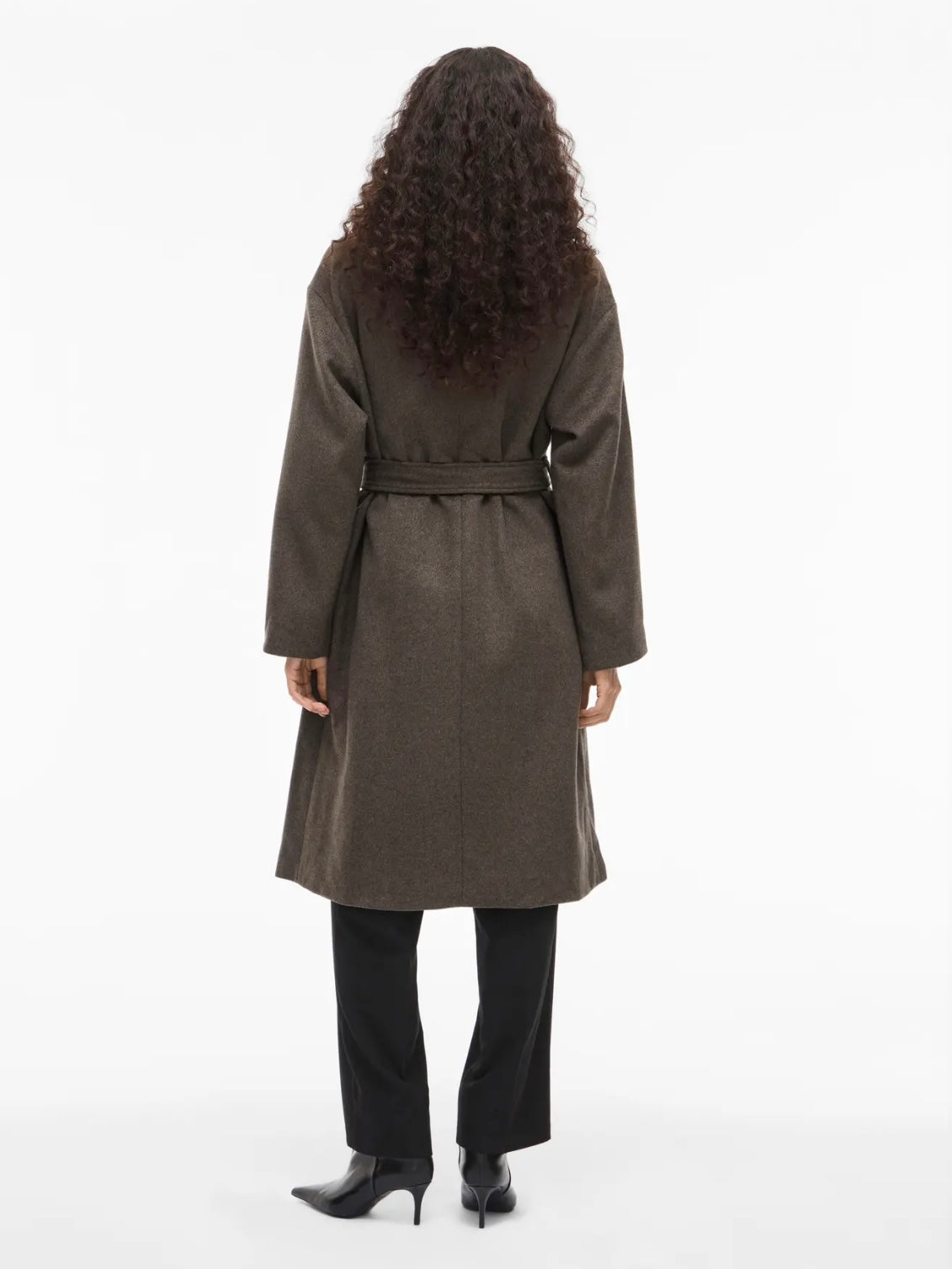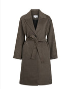 Tidløs lang kåpe fra Vila i en nydelig brunfarge. Kåpen lukkes med knapper og belte, og har lommer i sidene.
