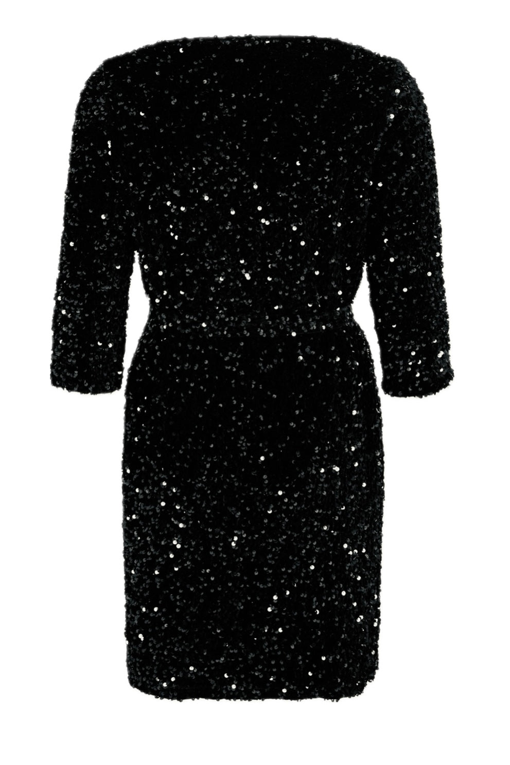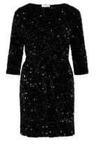 Kjolen har en klassisk båthals, trekvart lange ermer og et kroppsnært snitt som fremhever figuren på en elegant måte. Den er kledd i små glitrende detaljer som gir et sofistikert og festlig uttrykk – perfekt for sesongens selskapeligheter.