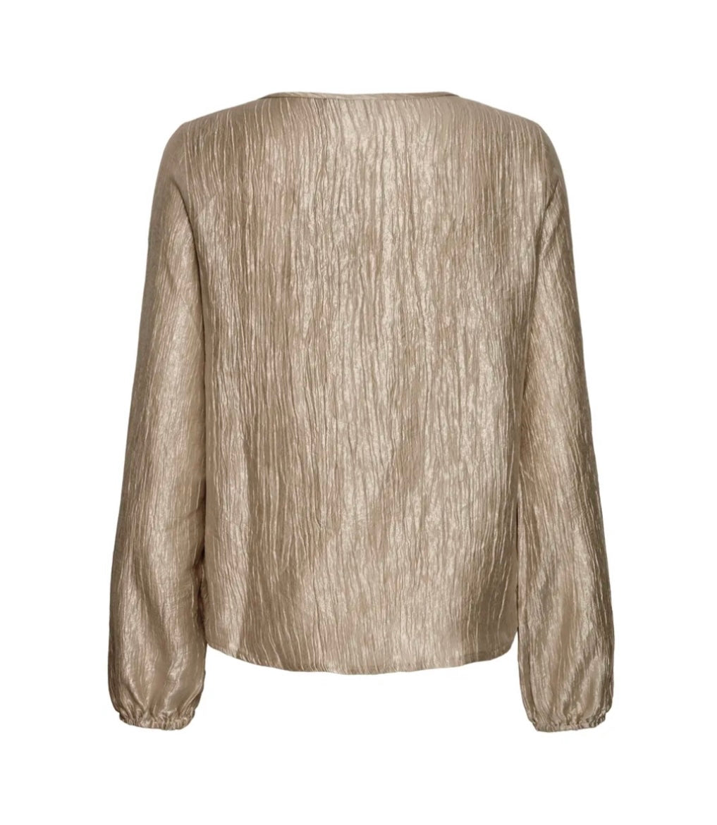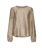 Blusen har en avslappet passform med rund hals og lange ermer med strikk i kanten, som gir en feminin ballongeffekt. Den skimrende gullfinishen gir antrekket ditt et løft – enten du styler den til bukser, skjørt eller jeans.