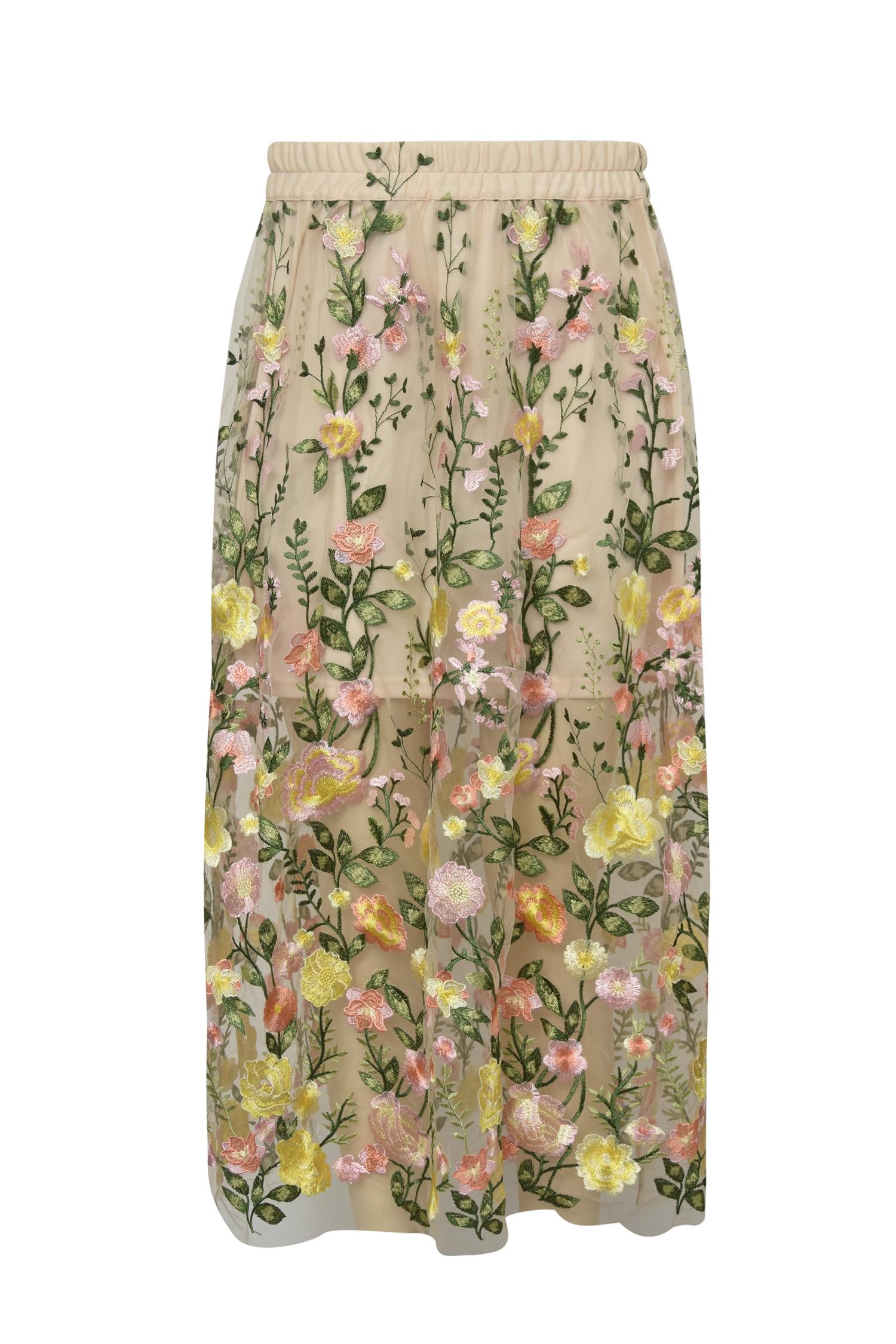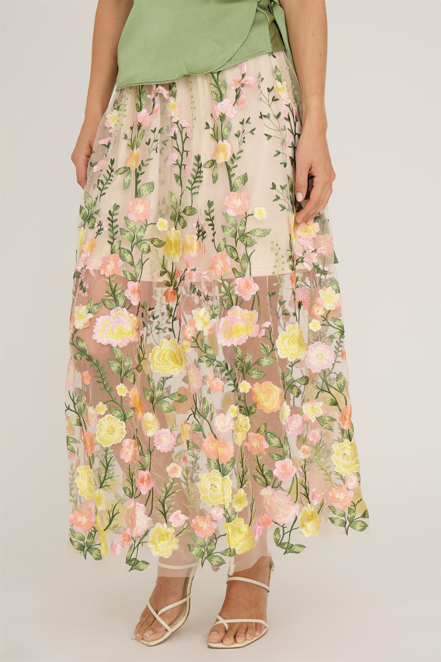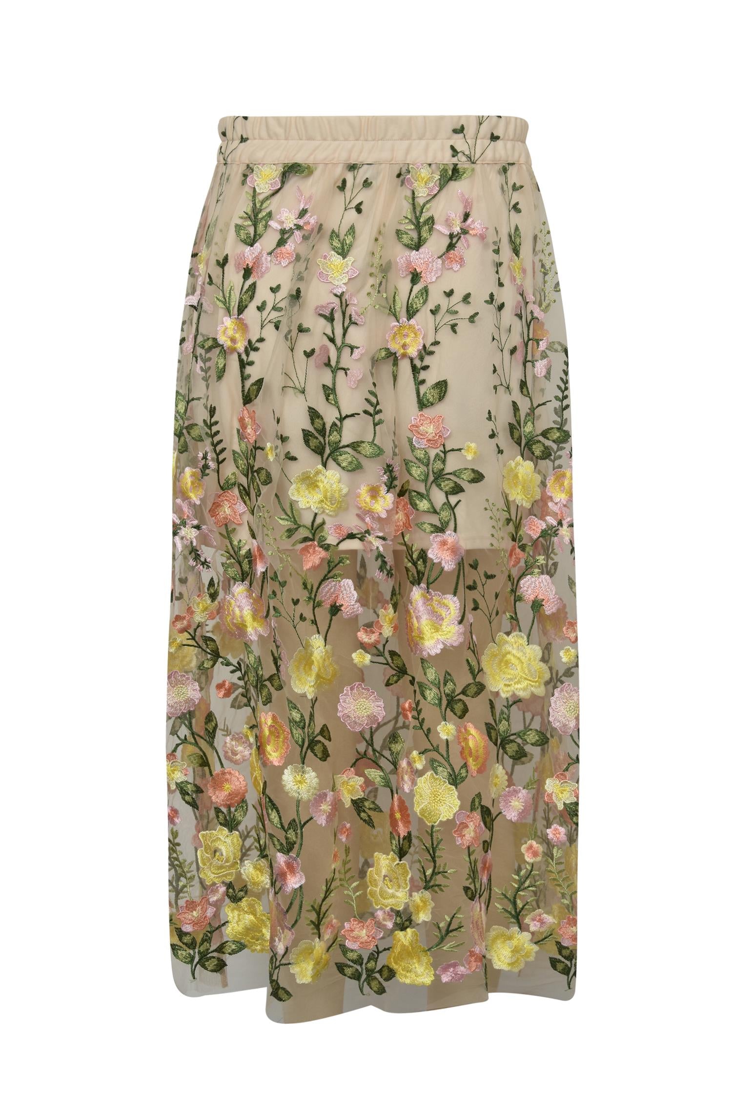 Dette vakre skjørtet fra A-View har et langt gjennomsiktig lag med mesh og broderte blomster i flere farger. Det er det perfekte valget for bryllup, festivaler, feiringer eller til hverdag med en strikkegenser eller en enkel t-skjorte.