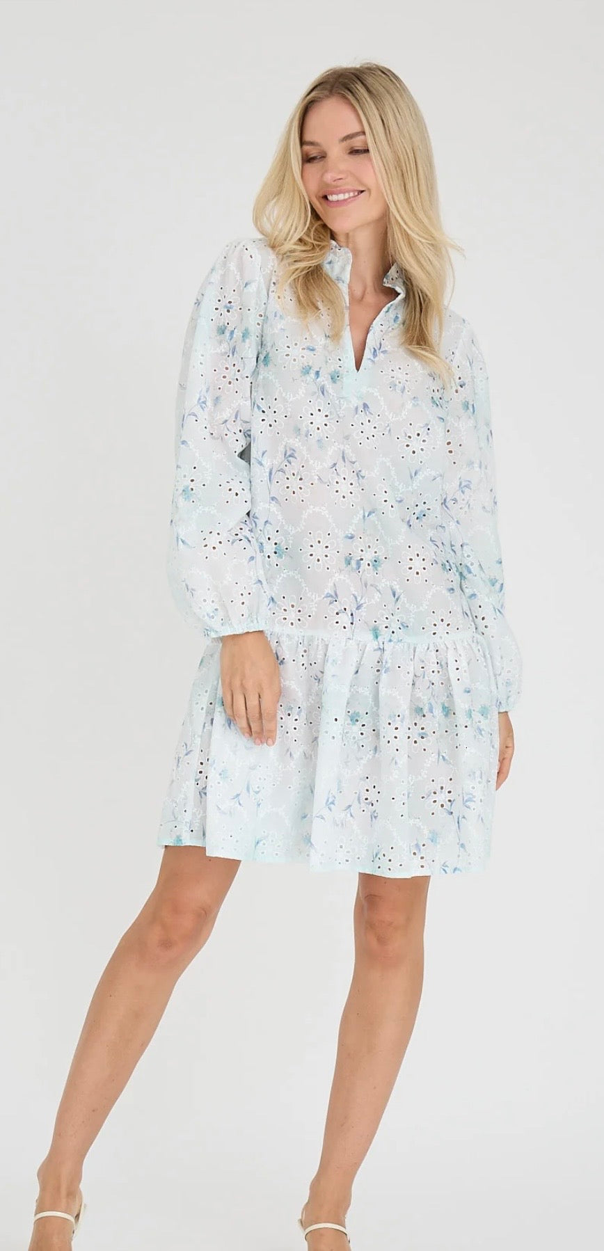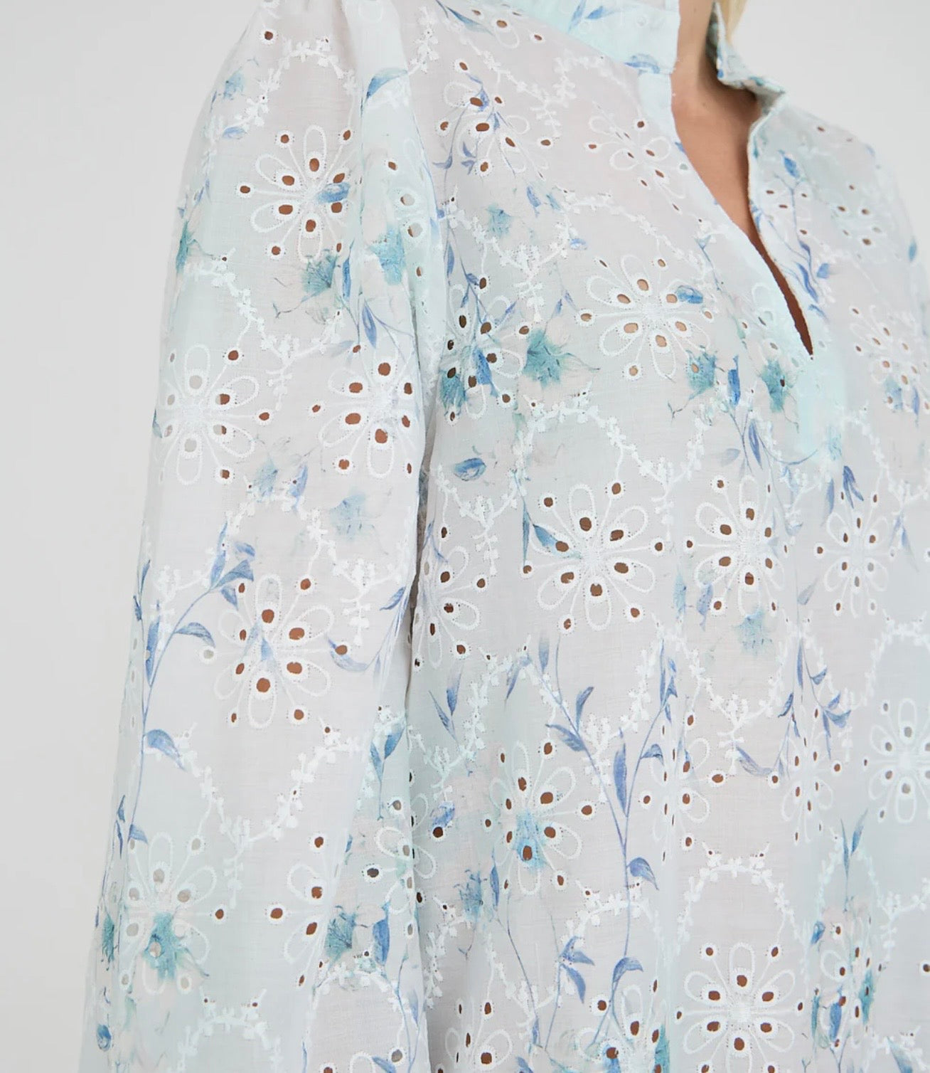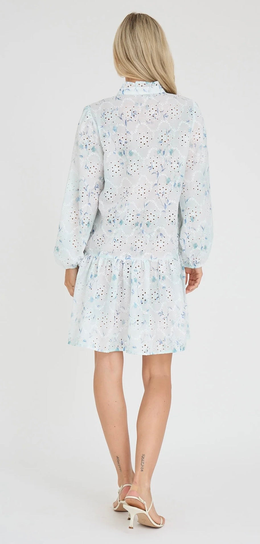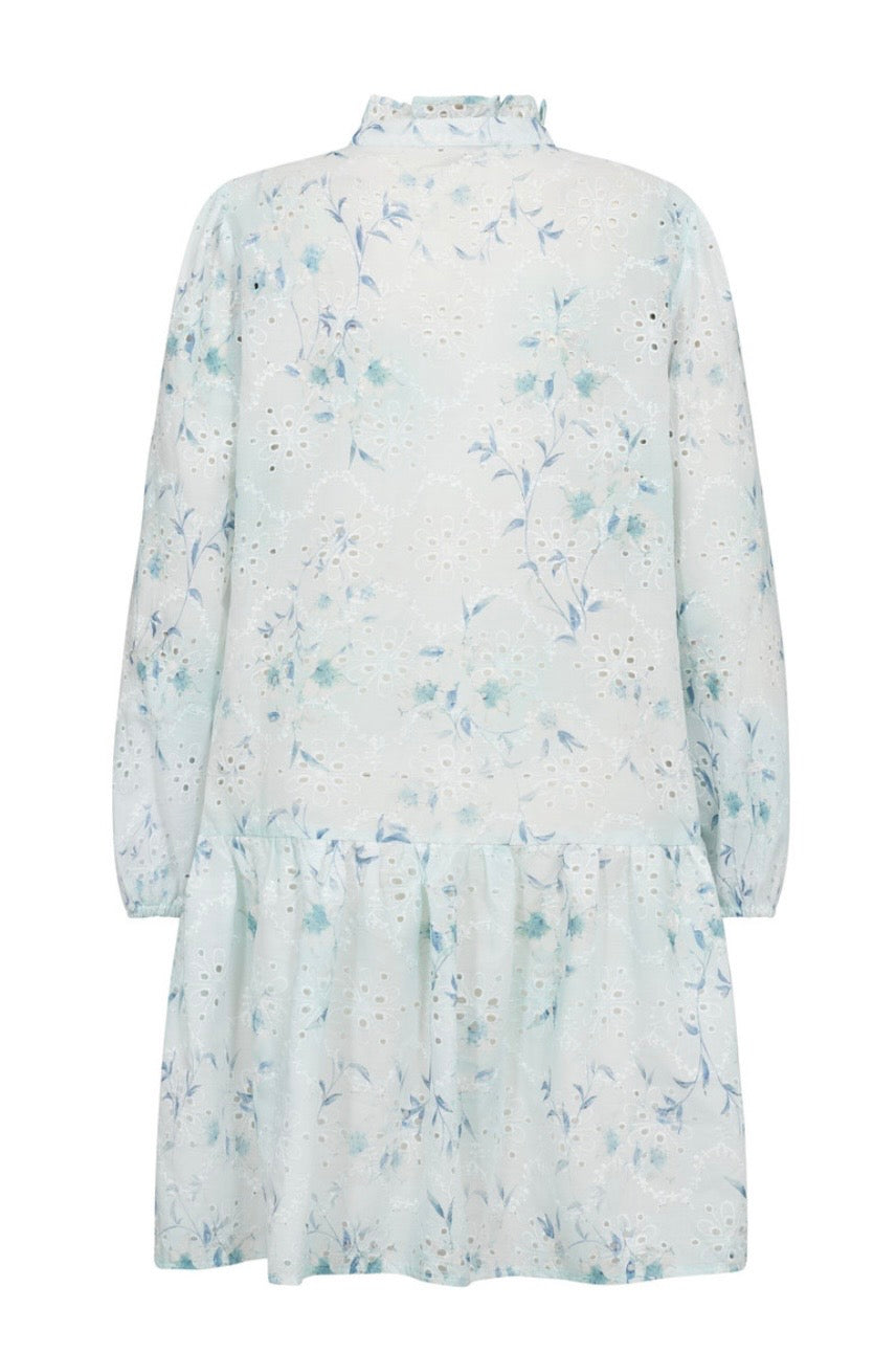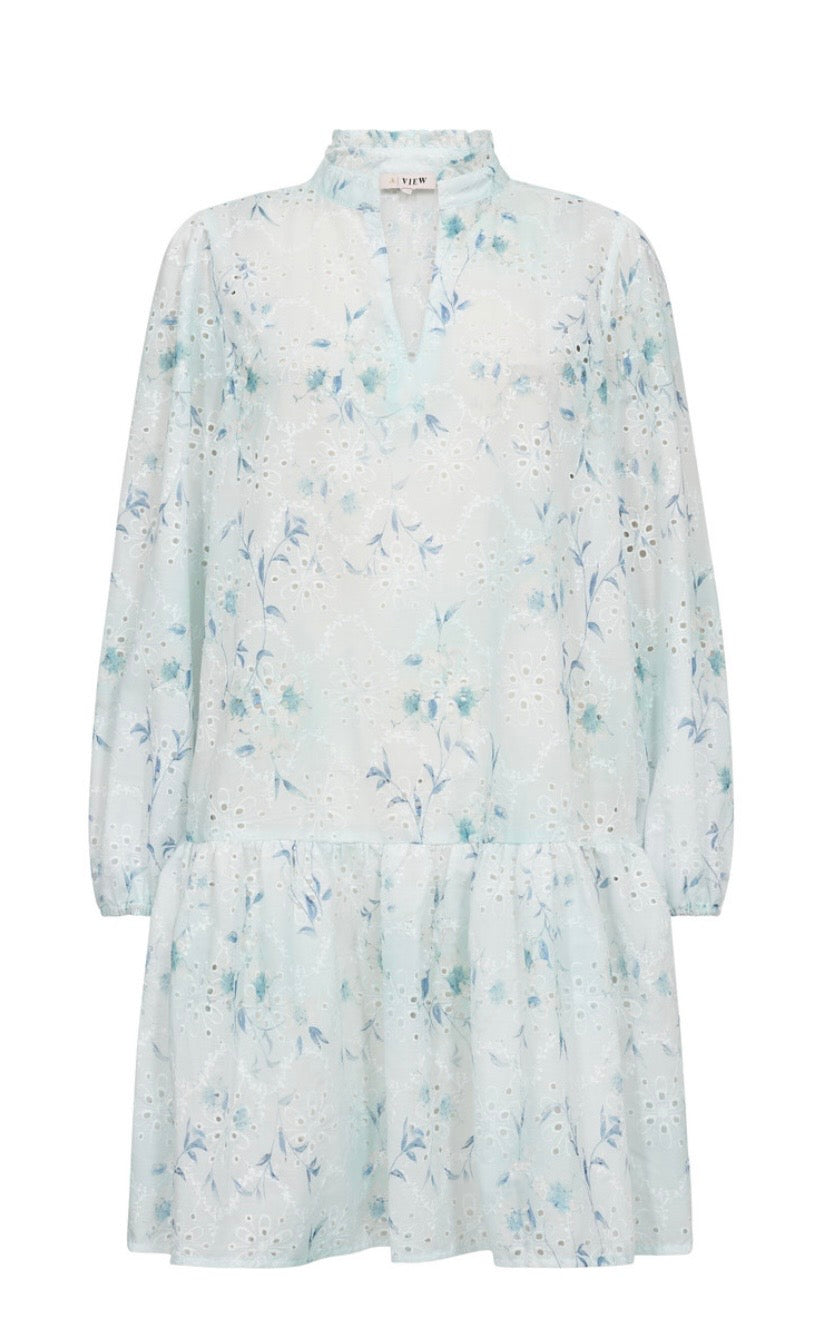 Grete Dress fra A-View er en lett og feminin kjole med mønster i blått og hvitt. Kjolen har V-åpning i halsen og lange ermer som gir et elegant og tidløst uttrykk.