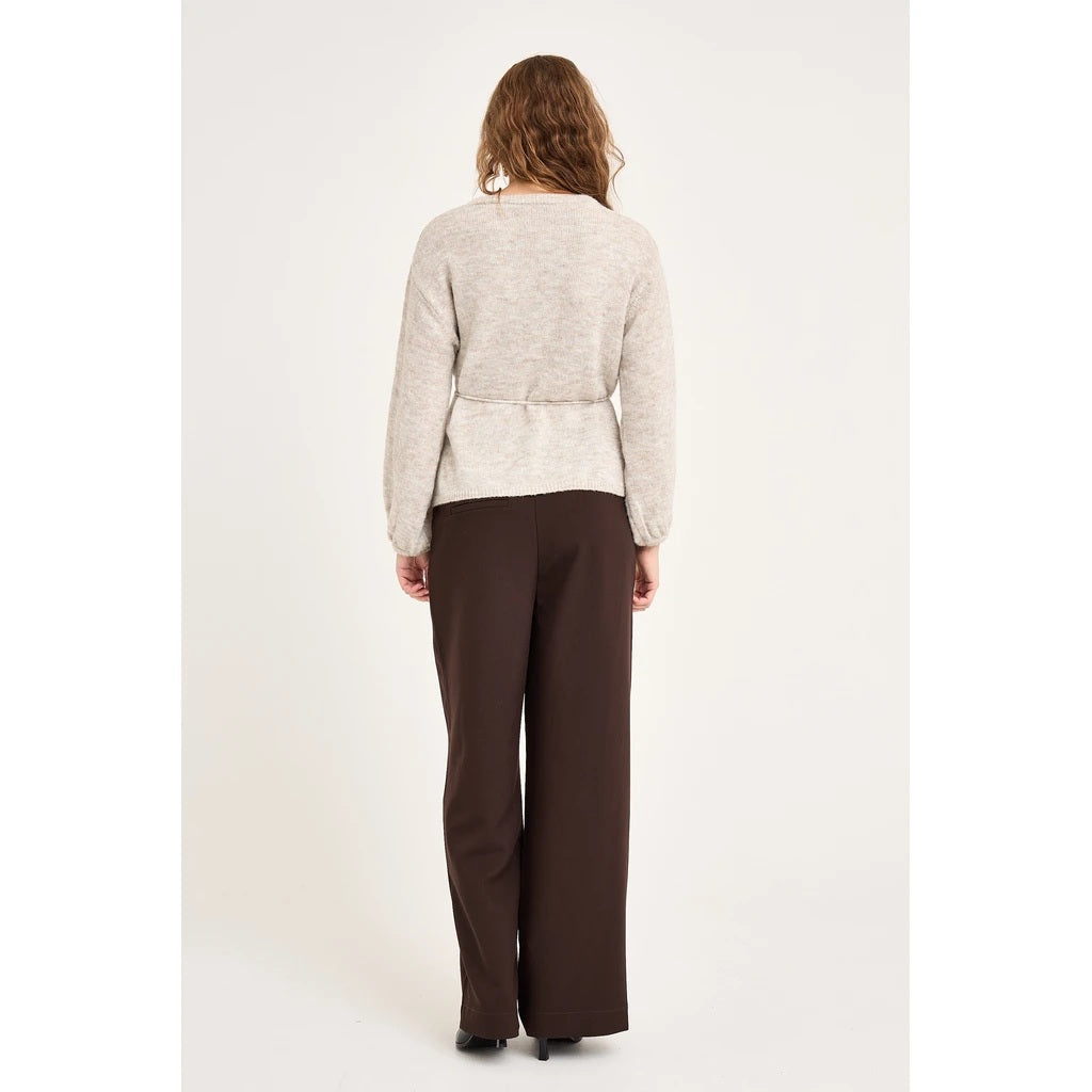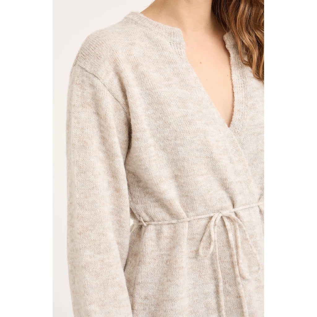 Lisette Knit Cardigan er en strikcardigan med omslagseffekt og knyting i midjen. Den har lange ermer, dyp V-utringning og en feminin passform. Strikken er normal i størrelsen.