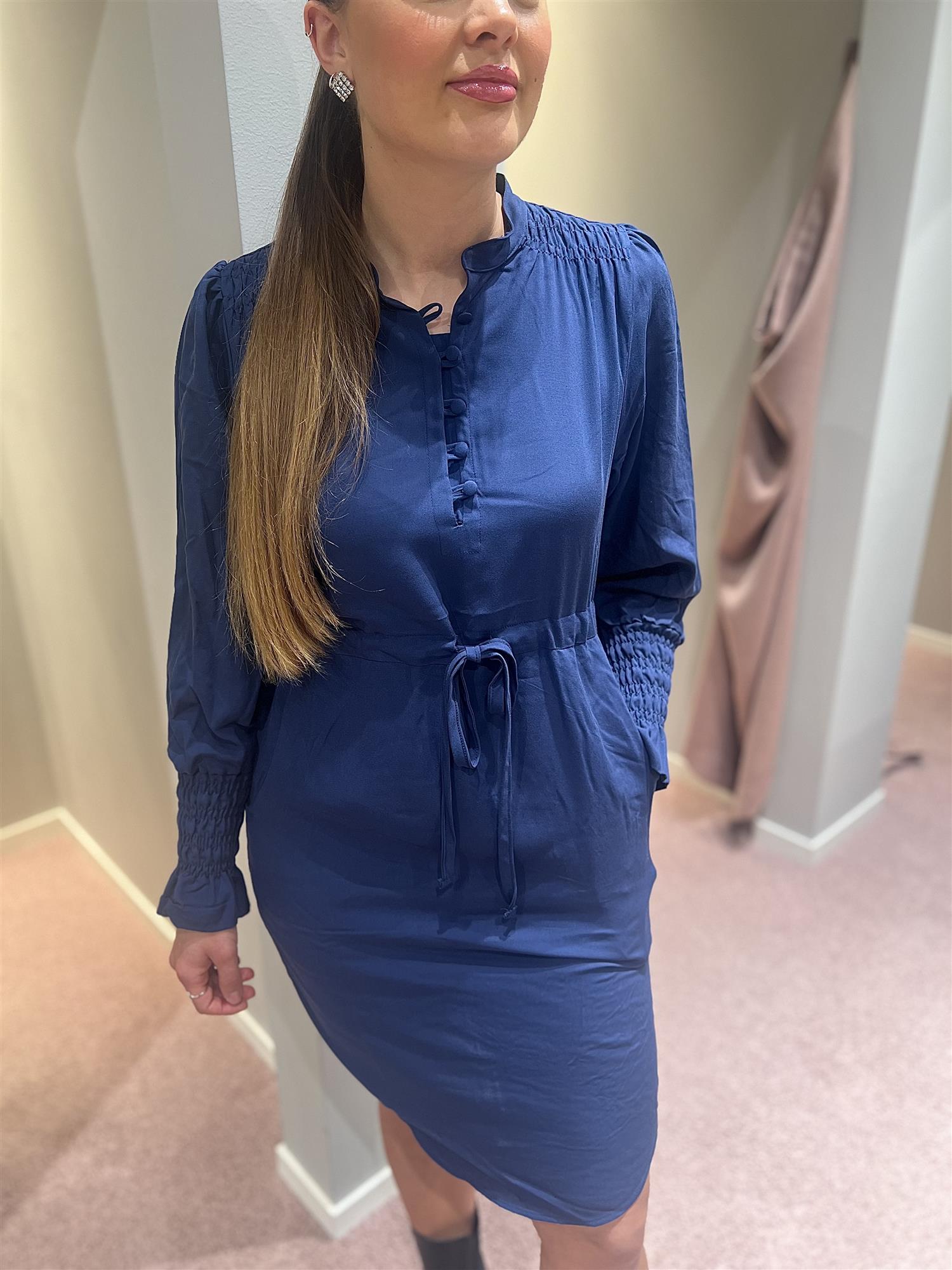 Den har knappedetaljer fremme, lange ermer med knytting i livet, har også lommer.