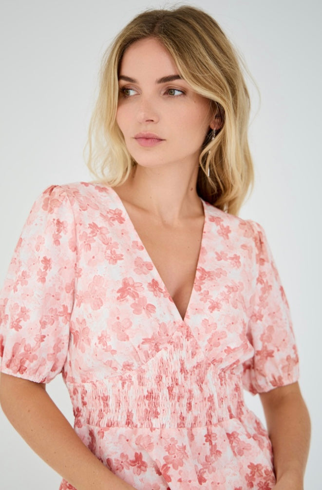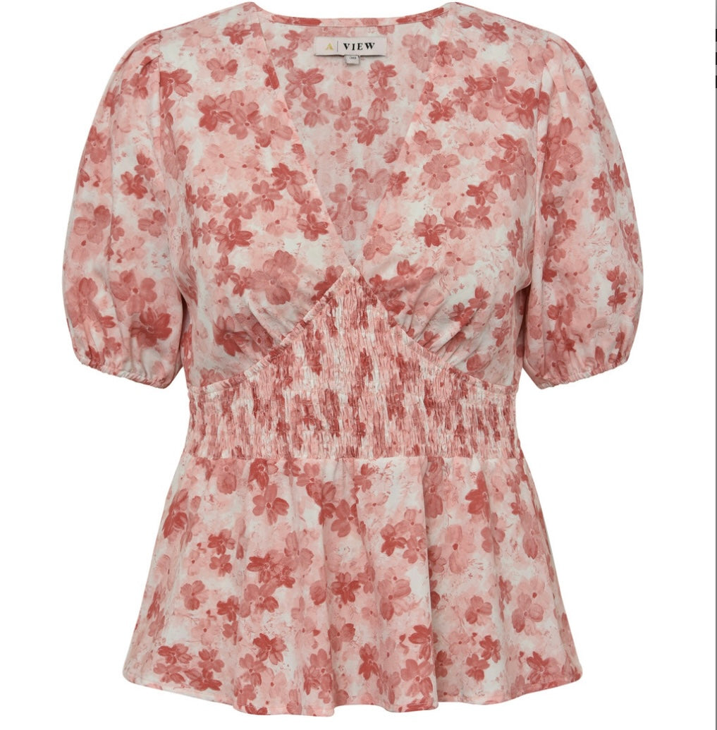 Lassie Blouse er en vakker bluse med et delikat blomsterprint som gir et friskt og feminin uttrykk. Den har en flatterende V-hals, puffede ermer som tilfører en sofistikert silhuett, og et smocket midjebånd som fremhever figuren. Denne blusen passer perfekt både til hverdags og mer pyntede anledninger.