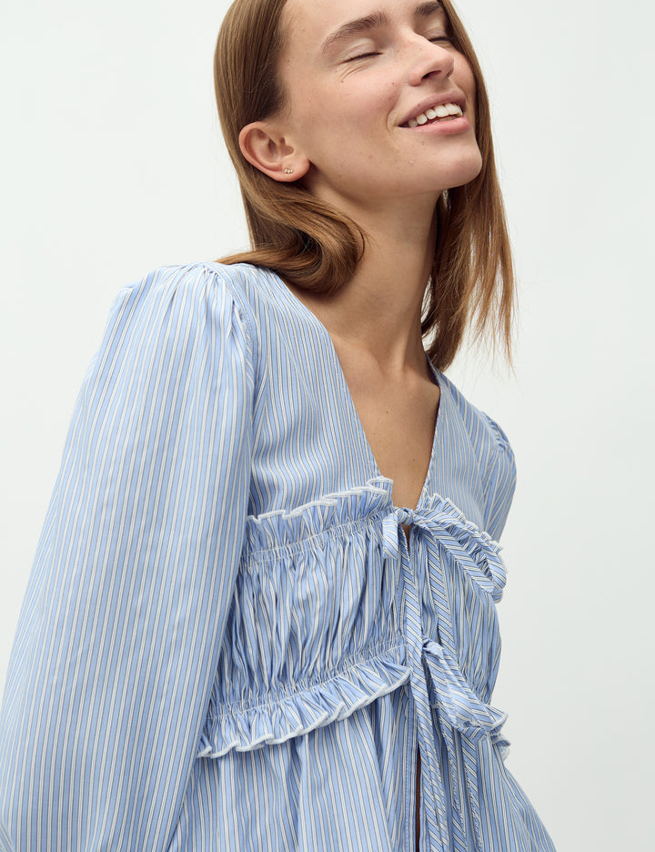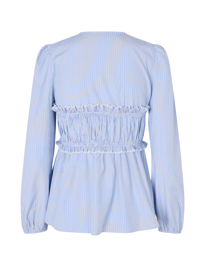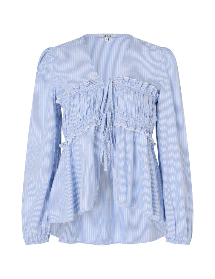 Den perfekte skjorten for en tidløs og elegant stil! Pipa Shirt fra mbyM har en flatterende V-hals, lange ermer med elastikk og en vakker knytedetalj i livet. Den løse passformen gir et avslappet uttrykk, mens de blå-hvite stripene tilfører en klassisk touch.