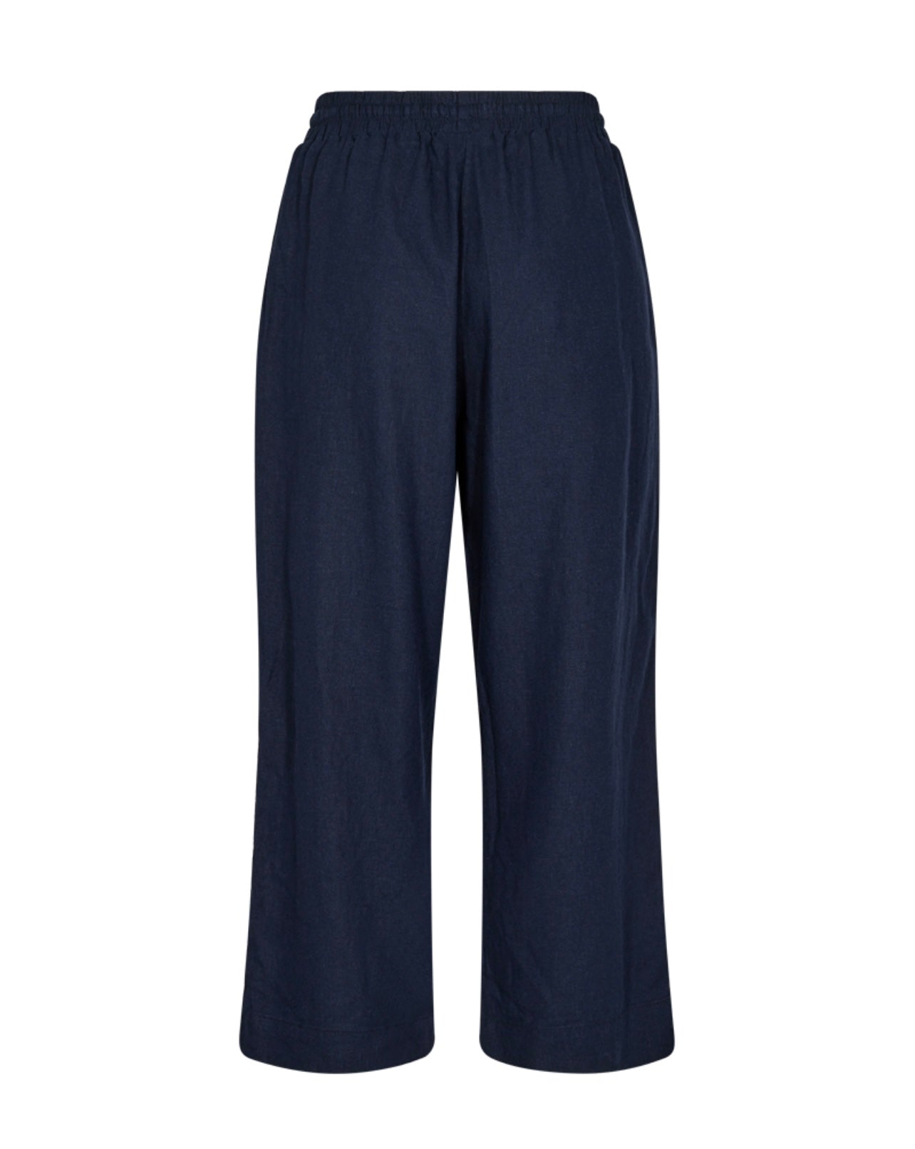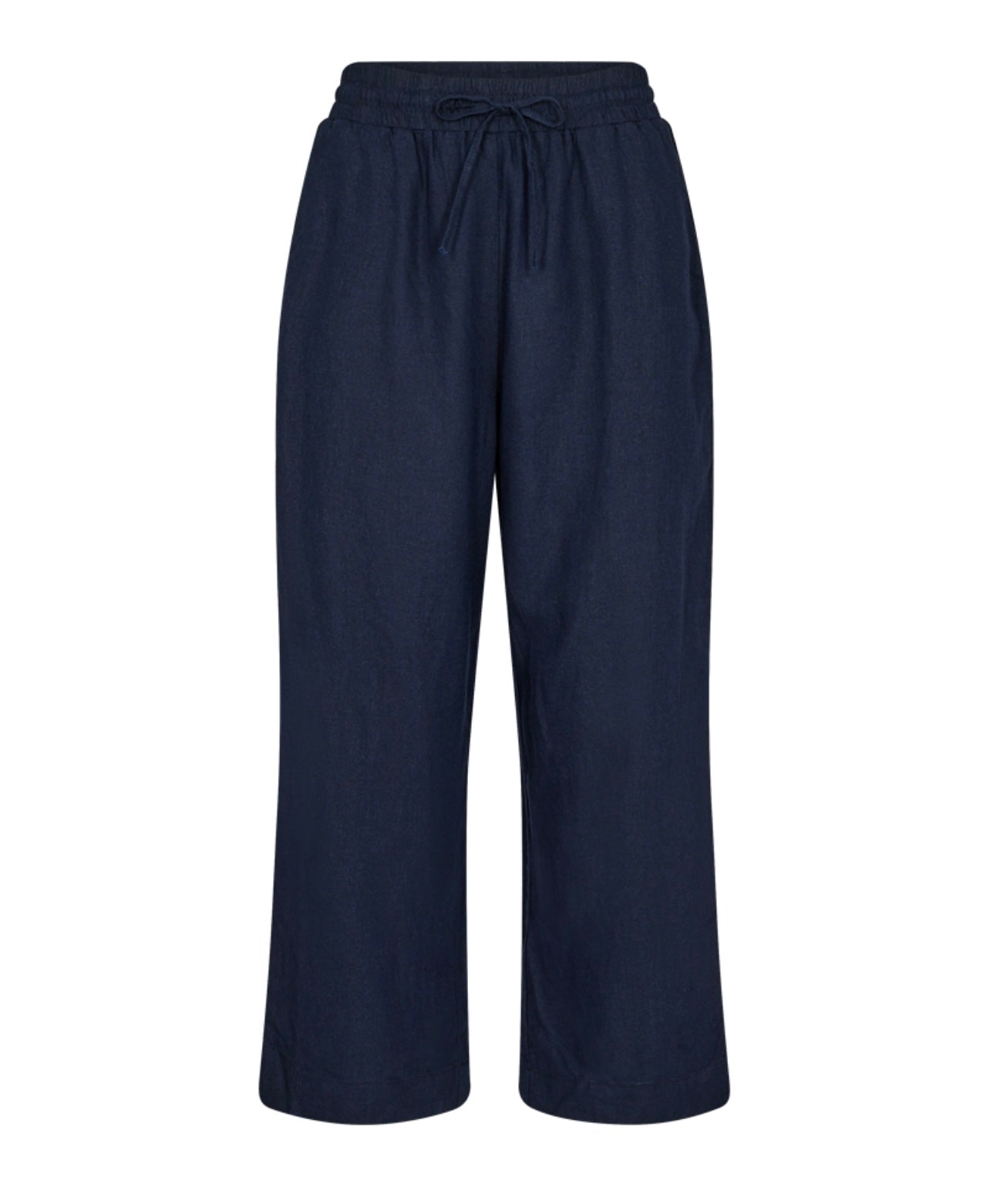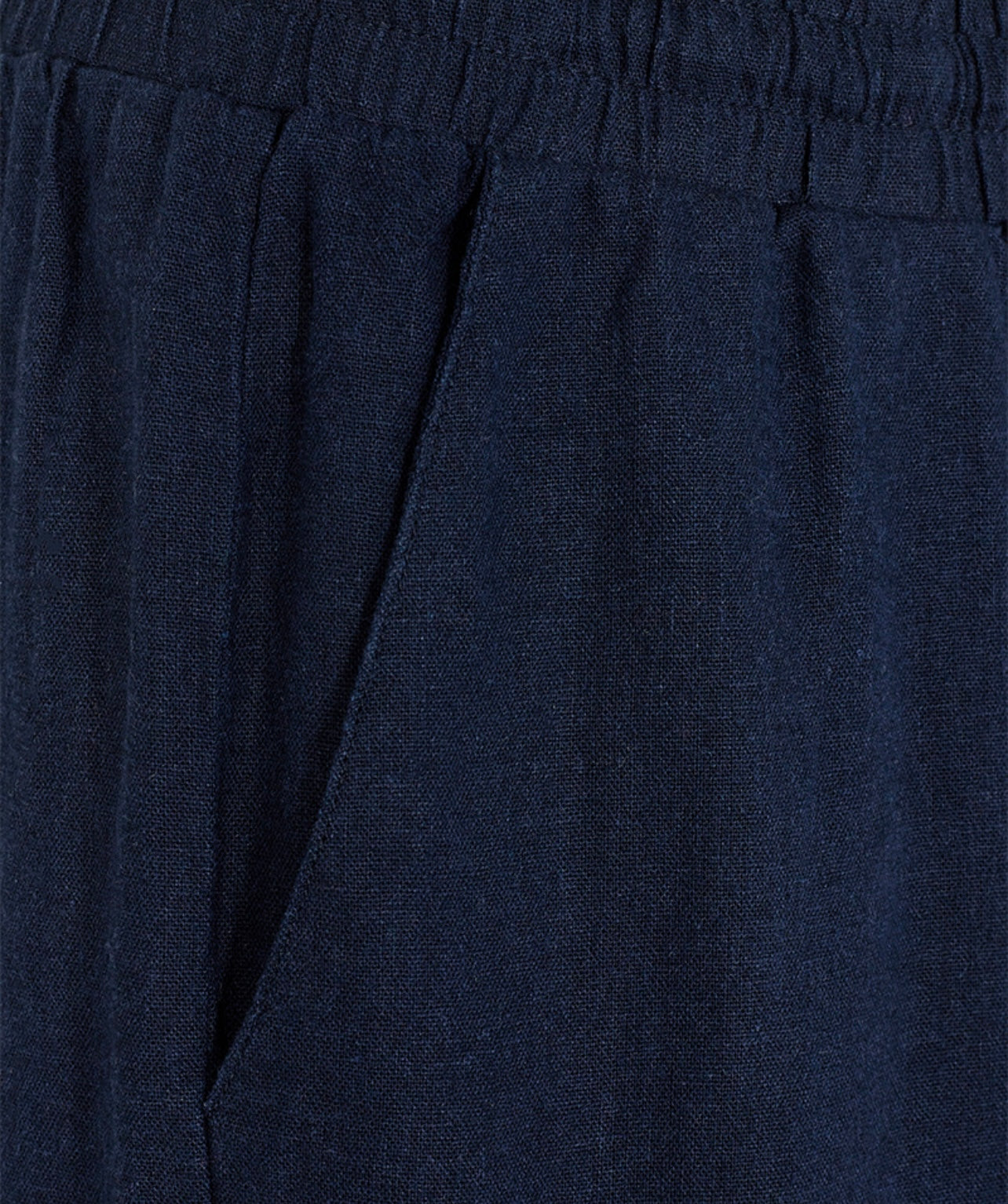 Bukser fra Freequent i lett linmateriale av høy kvalitet. Buksene er høyt livet med en avslappet passform, sidelommer, en justerbar snøring i livet og 7/8 lengde. Et nydelig par bukser av god kvalitet.