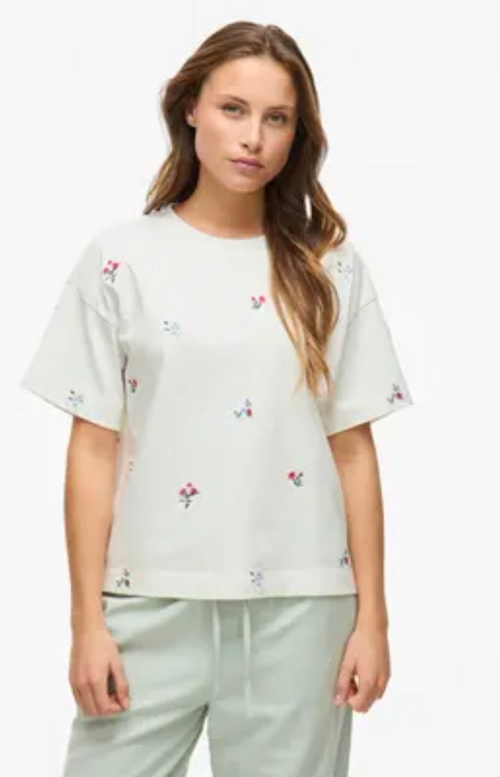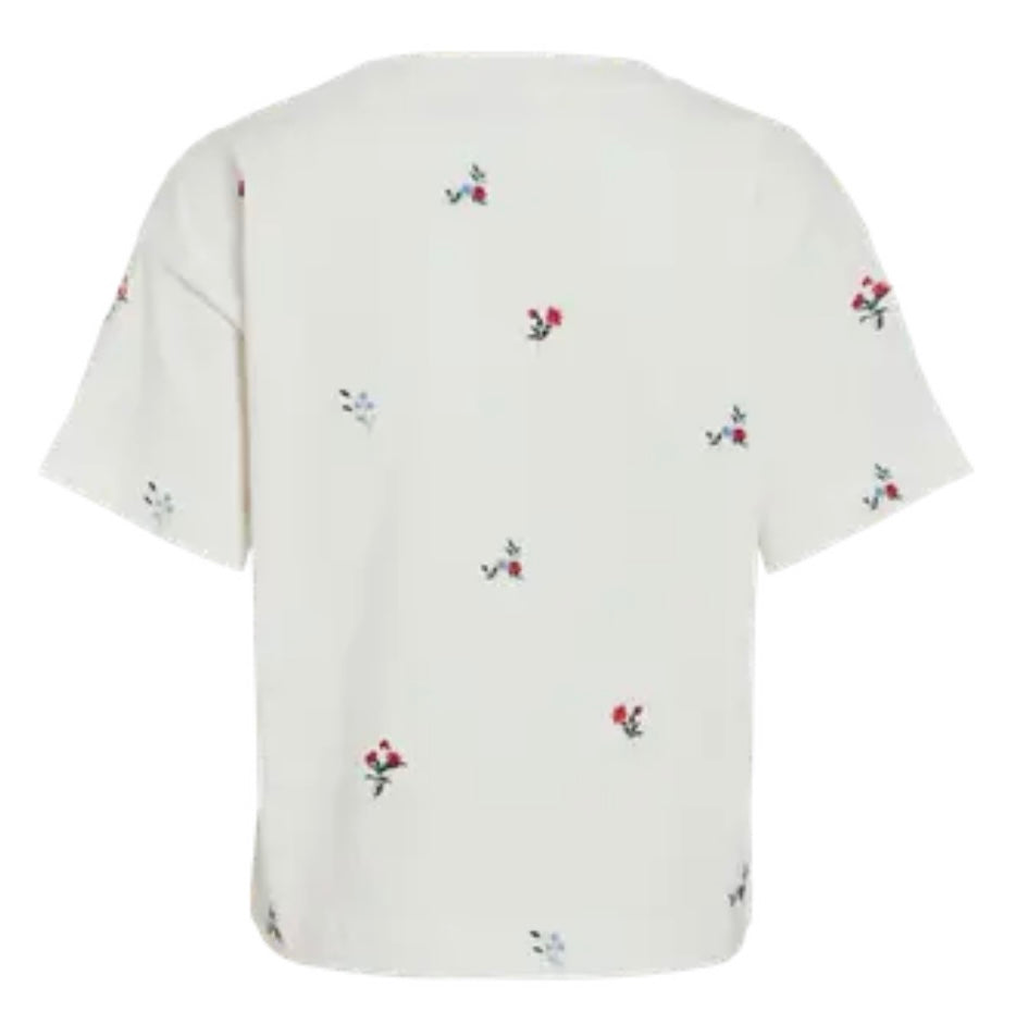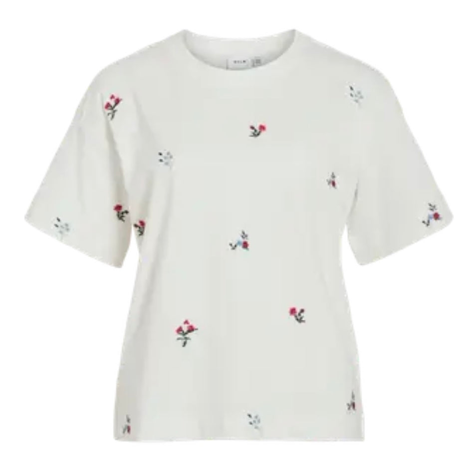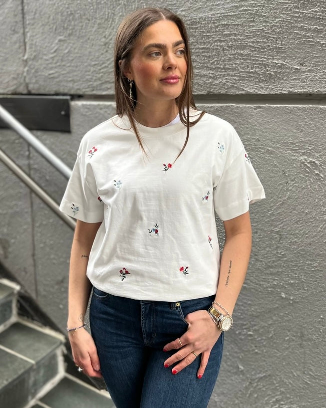 Enkel og basic t-skjorte, med små broderte blomster detaljer med farger. Kan styles til flere plagg! Must have i garderobeskapet til sommeren.