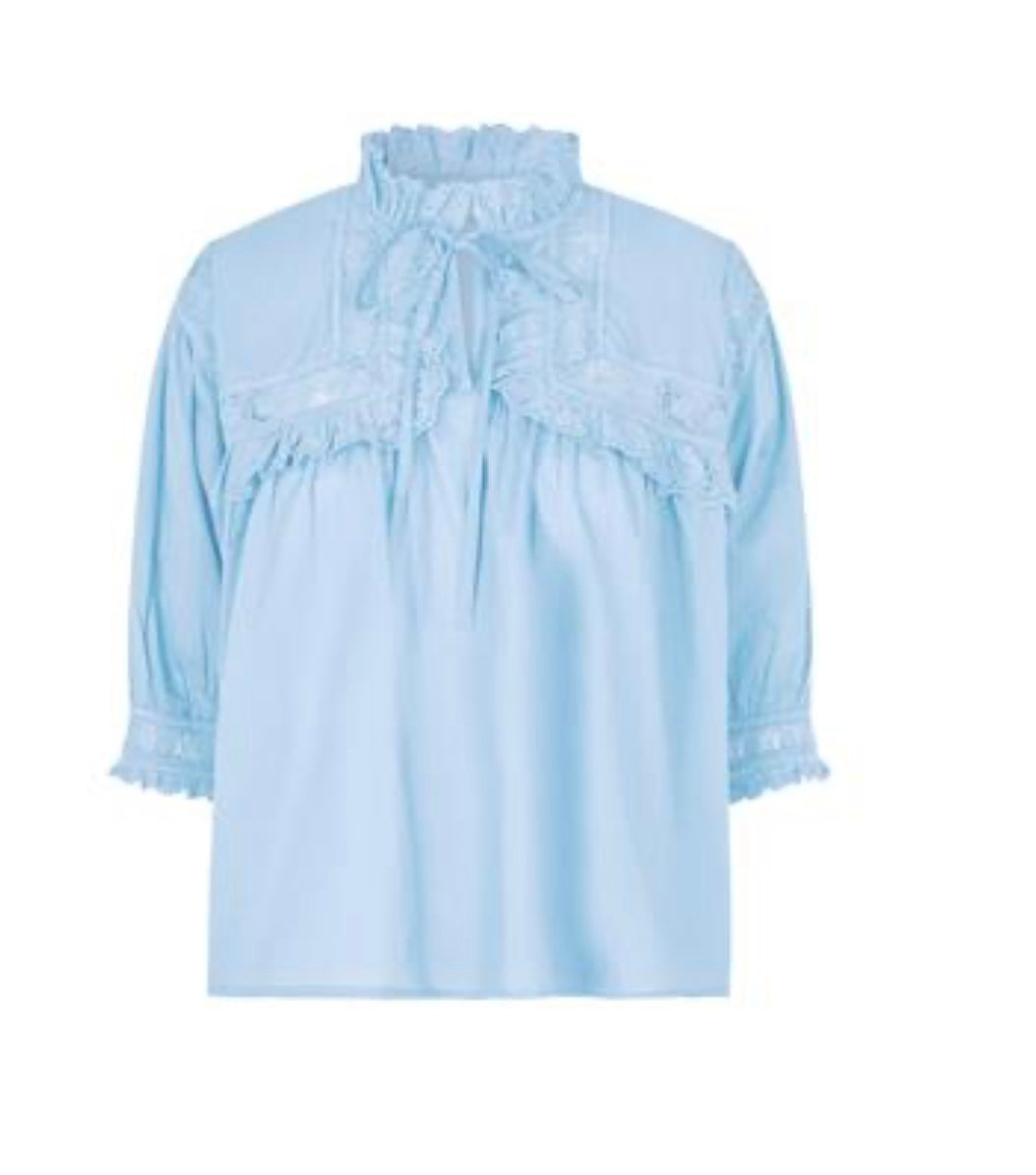 Søt bluse fra MbyM med korte armer og knyting ved halsen. Også mulig å style sammen med et matchende skjørt. Tilgjengelig i flere farger. Laget i 100% bomull.