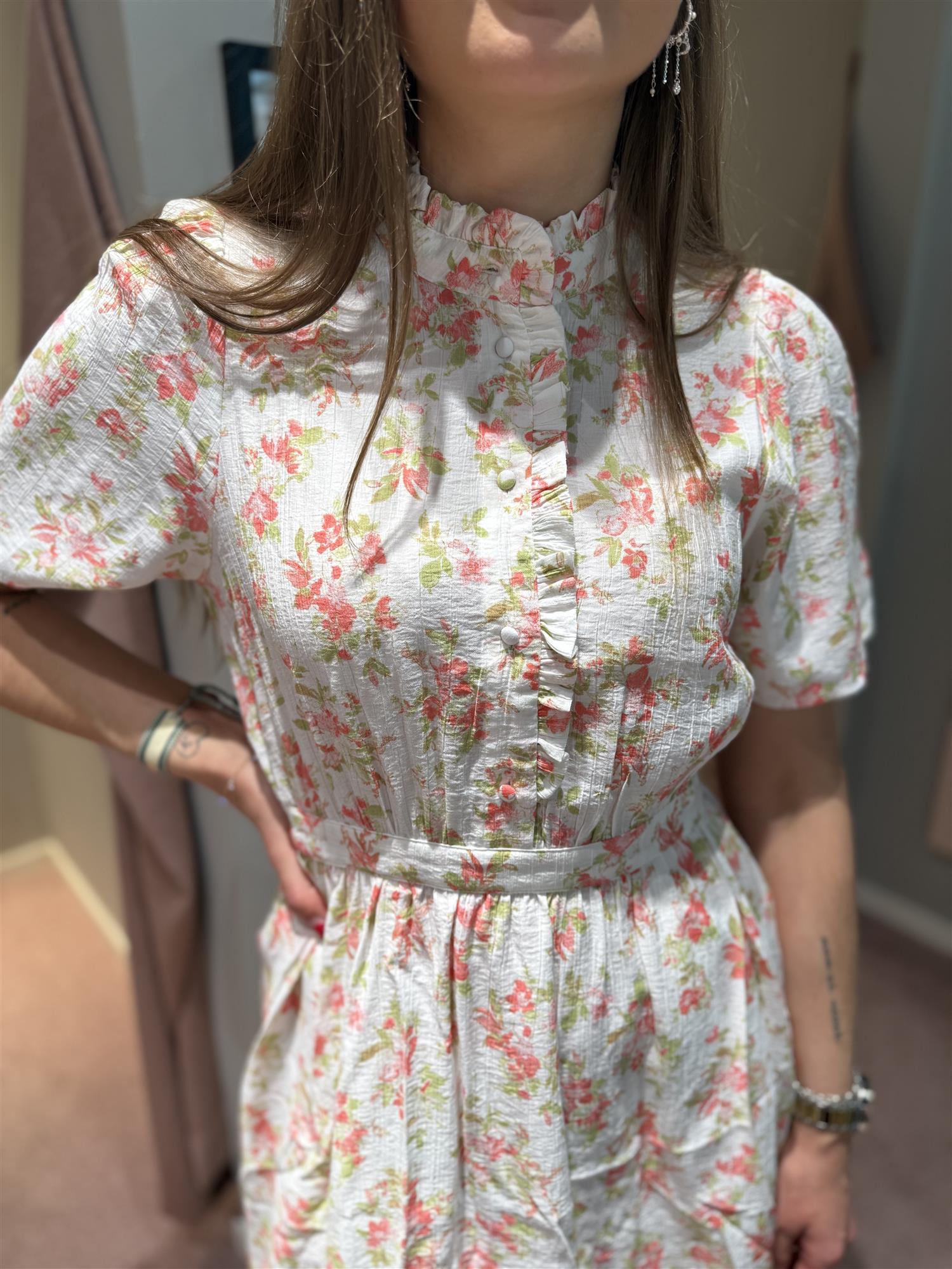 Super søt kjole fra Raus med blomsterprint, knapper, strikk i liv og lommer i siden. Tilgjengelig i flere farger.