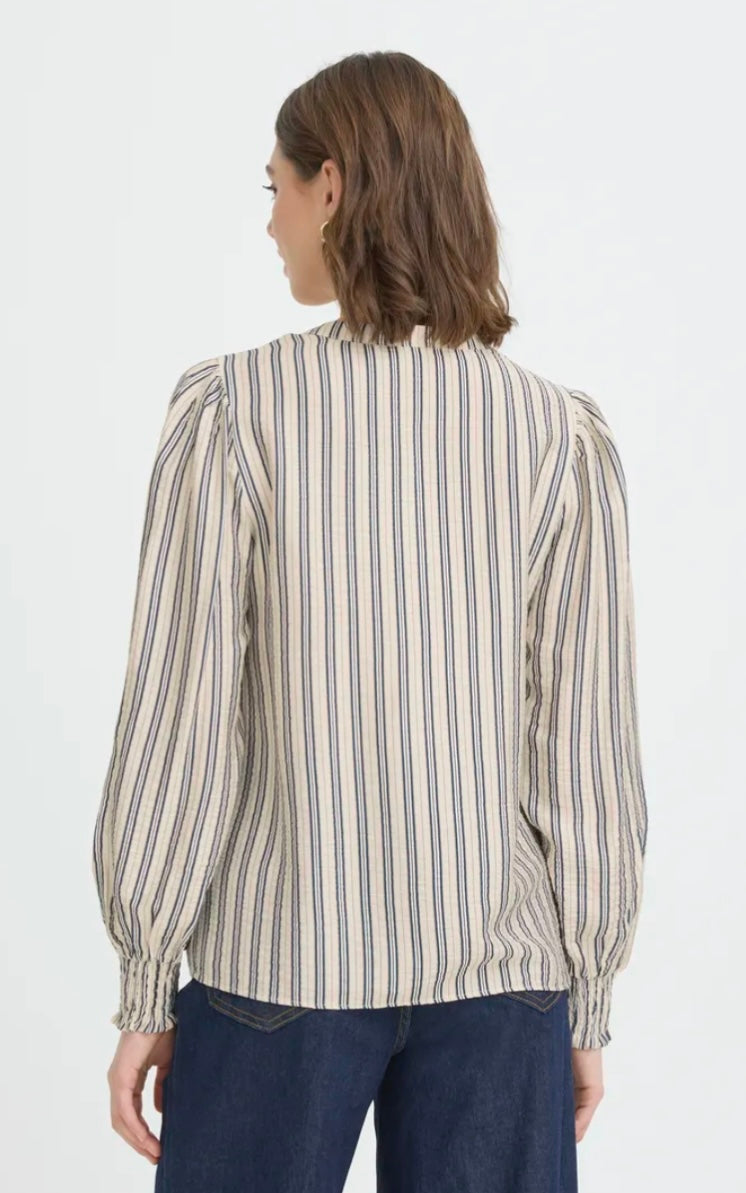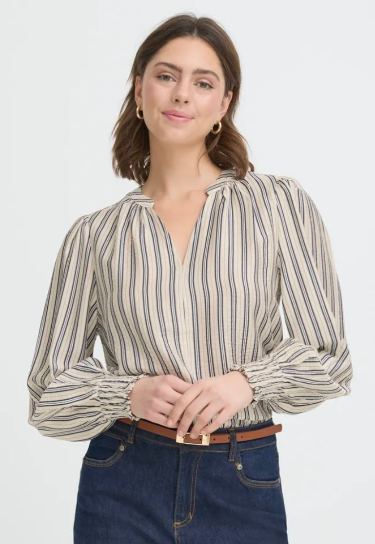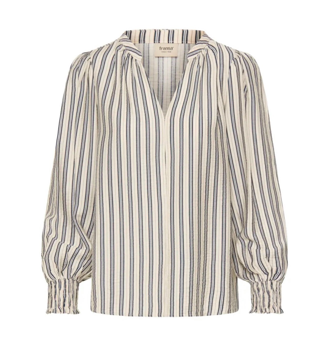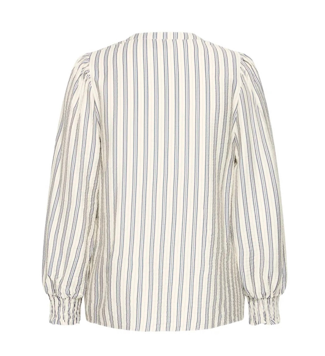 Kamila Blouse fra Fransa er en lett bluse med et tidløst stripemønster. Den har en avslappet passform, V-hals og elegante lange ermer.