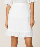 Skjørtet har flat linning i front og elastisk strikk bak. lengde - rett over kne og har en flott volangkant.