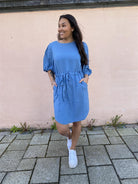 Margot er en nydelig kjole fra det nye merket vårt Mille & Me. Kjolen har en rund hals, 3/4 lange ermer, knytting i livet og lommer.