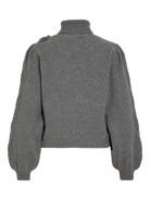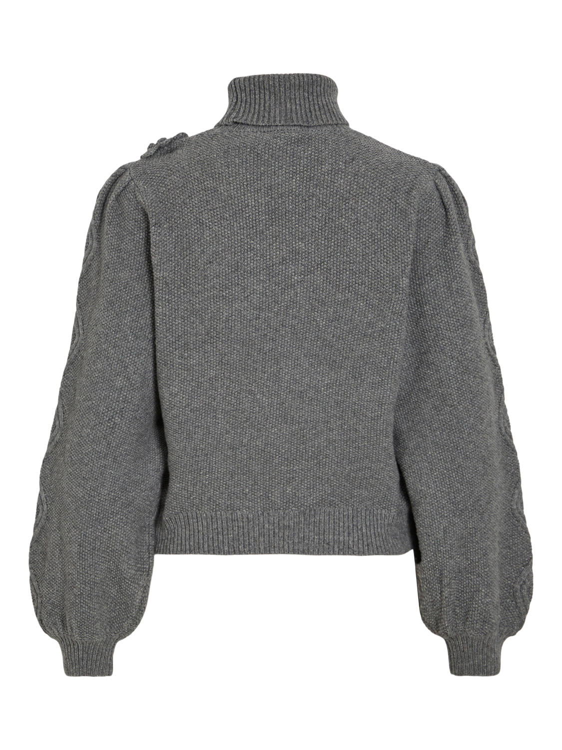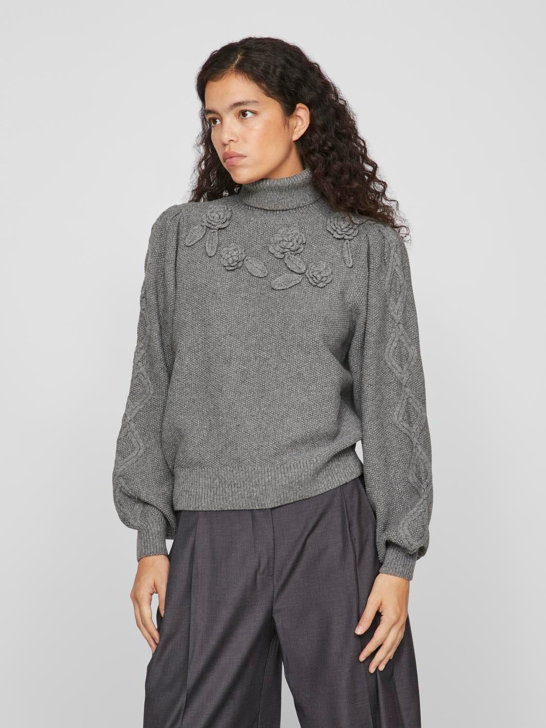 Strikket genser med høy hals, lette ballongermer med mønster og fine påsydde blomster i front.