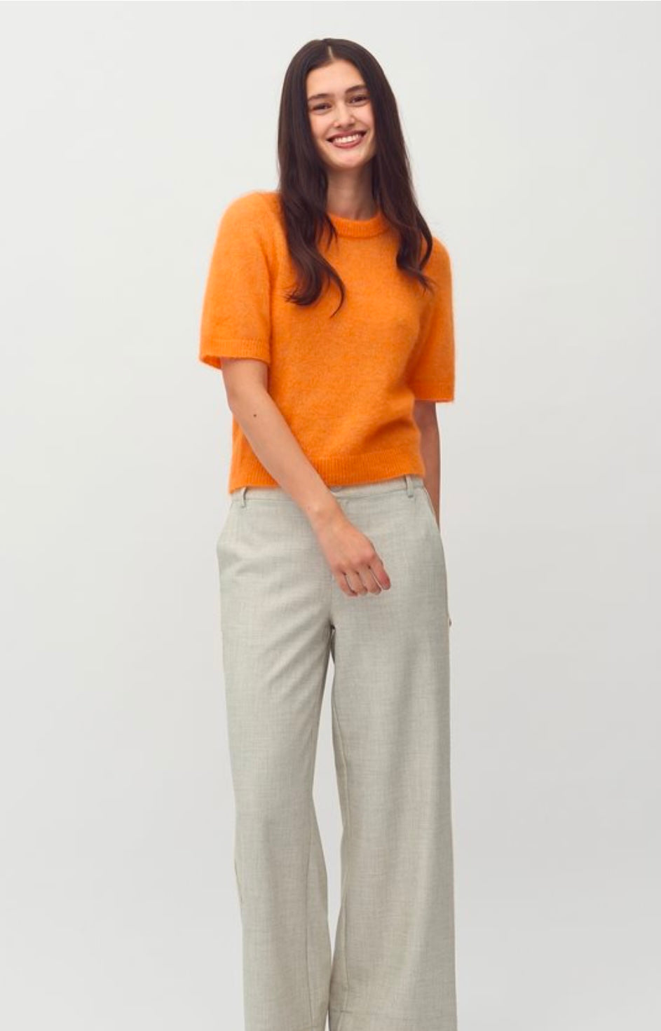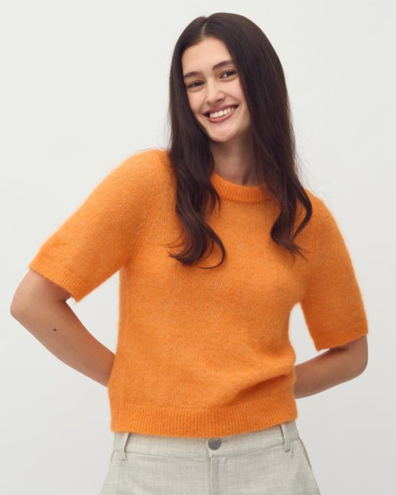 Carla Strikk er en tynn, kortermet strikkegenser i et eksklusivt ull- og mohairblanding som gir en myk og luftig følelse. Den har en rund hals, løs passform og en lett tekstur som gjør den perfekt for både lag-på-lag styling eller alene på mildere dager.