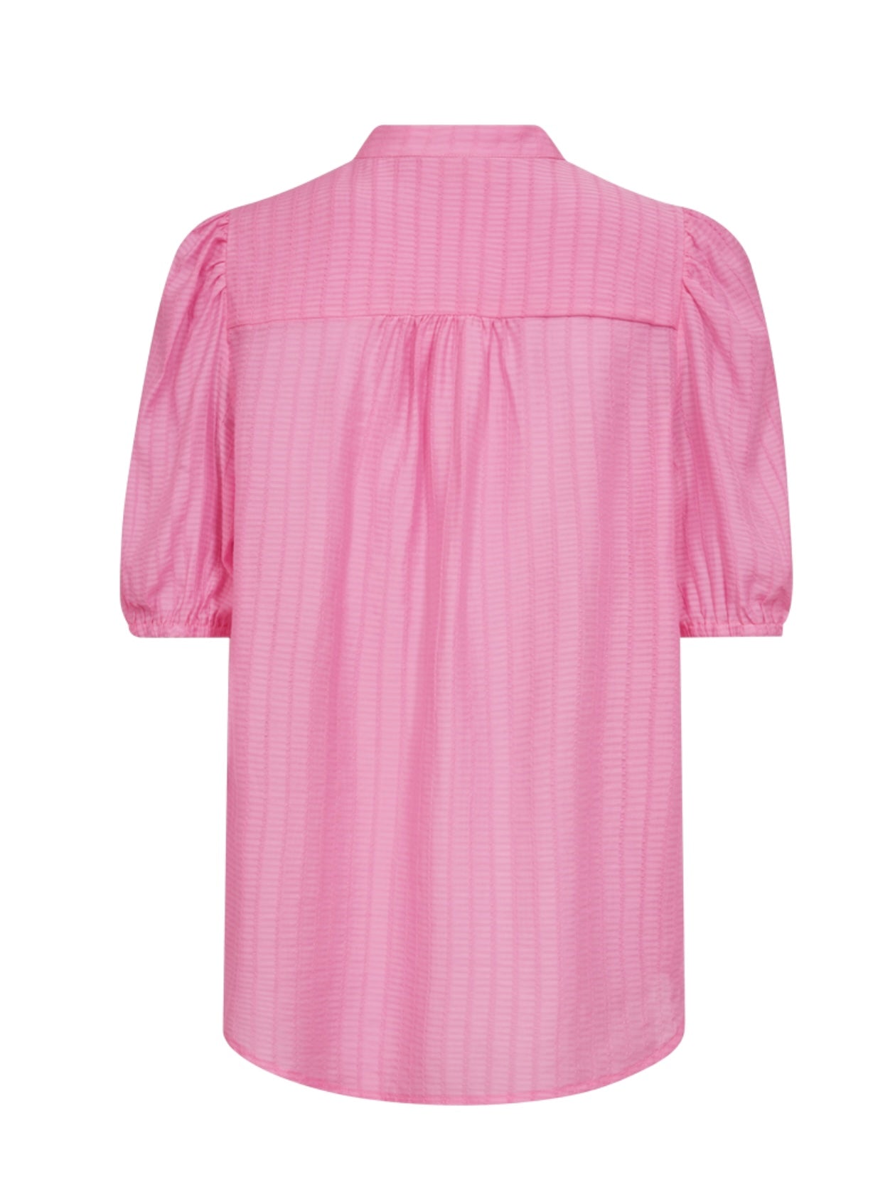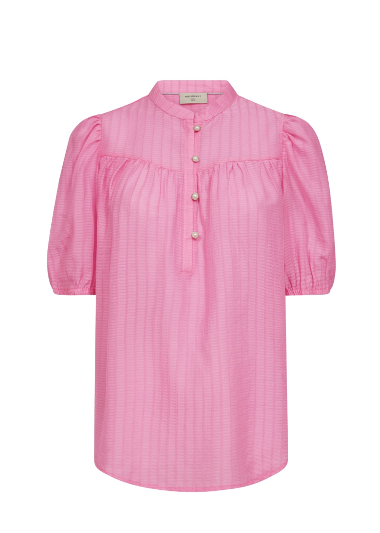 Denne blusen fra Freequent er laget i et lett materiale med et subtilt teksturmønster som gir et sofistikert uttrykk. Den har korte ballongermer med elastiske mansjetter som gir en feminin og komfortabel passform. Blusen har knappelukking foran med vakre knapper som har en elegant perlemorsfinish. Med sin enkle silhuett og avslappede passform er den perfekt for både hverdagsbruk og mer uformelle anledninger.