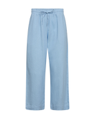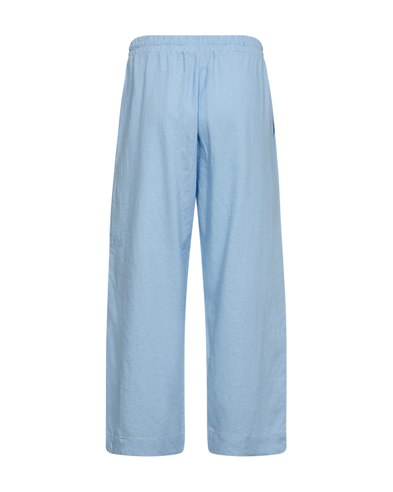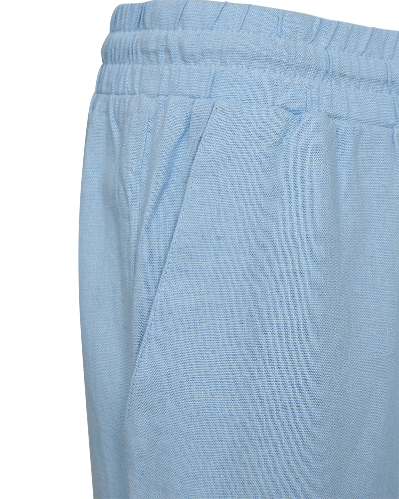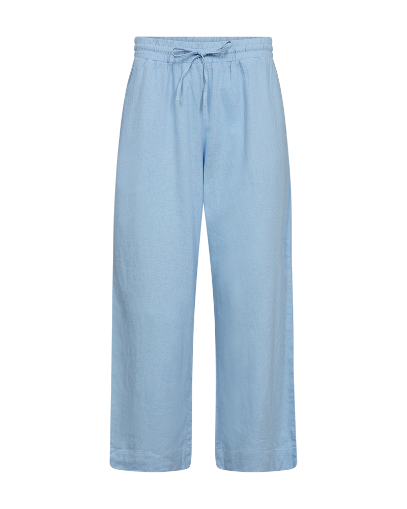 Bukser fra Freequent i lett linmateriale av høy kvalitet. Buksene er høyt livet med en avslappet passform, sidelommer, en justerbar snøring i livet og 7/8 lengde. Et nydelig par bukser av god kvalitet.