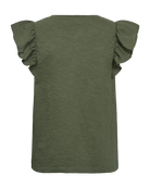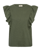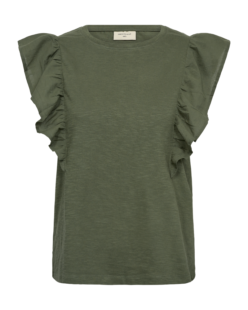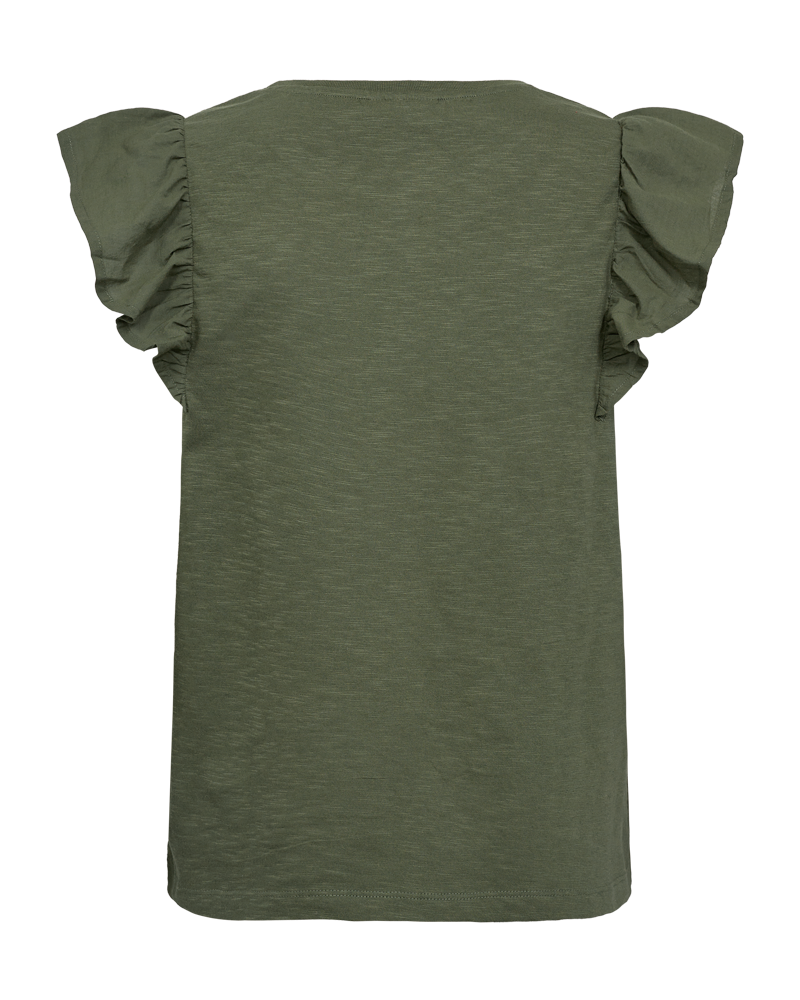 T-skjorte fra Freequent i et mykt materiale. T-skjorten har en enkel silhuett komplett med avrundet hals med ribbestrikk, korte volangermer og en elegant, løs passform.